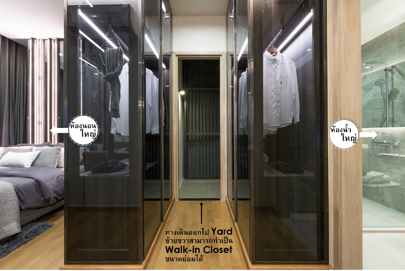 มาต่อกันที่ห้องนอนและห้องน้ำใหญ่กันเลยดีกว่า... เมื่อเดินมาจากห้องนั่งเล่นจะเจอประตูออกไป Yard ซ้ายมือจะเป็นห้องนอน ขวามือเป็นห้องน้ำ ซึ่งทางตรงกลางนี่เองสามารถแปลงร่างเป็น Walk-In Colset ขนาดย่อมได้