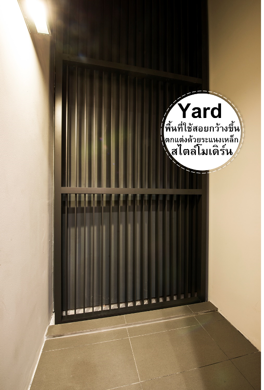 โดยตกแต่งด้วยระแนงเหล็กสไตล์โมเดิร์น แต่ก็มีข้อดีตรงที่ไม่ได้ปิดทึบ มีบานพับที่เปิดปิดรับแสงได้... ก็อย่างว่าแหละ คนอยู่คอนโดระดับนี้แล้วก็คงไม่มีใครคิดจะซักผ้าห่มผ้านวมเองแน่นอน ฉะนั้น ถ้าไม่ได้ใช้ Yard เพื่อเป็นลานซักล้างก็อาจจะเปลี่ยนโซนนี้ให้เป็นโซนนั่งเล่นพักผ่อนอีกจุดก็ยังได้
