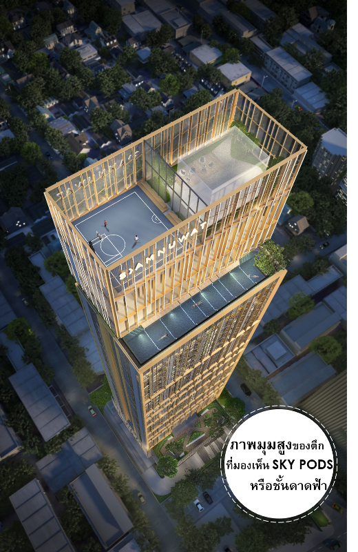 และถ้ามองจากมุมสูงก็จะเห็น SKY PODS หรือชั้นดาดฟ้าที่เปิดโล่งมีทั้งสนามบาสเกตบอลและพื้นที่สังสรรค์ทำกิจกรรมได้หลากหลาย รวมทั้งตัว POOL PODS ที่เปิดโล่งมองขึ้นมาเห็นท้องฟ้าด้านบนได้
