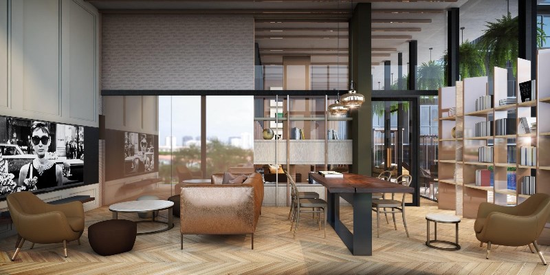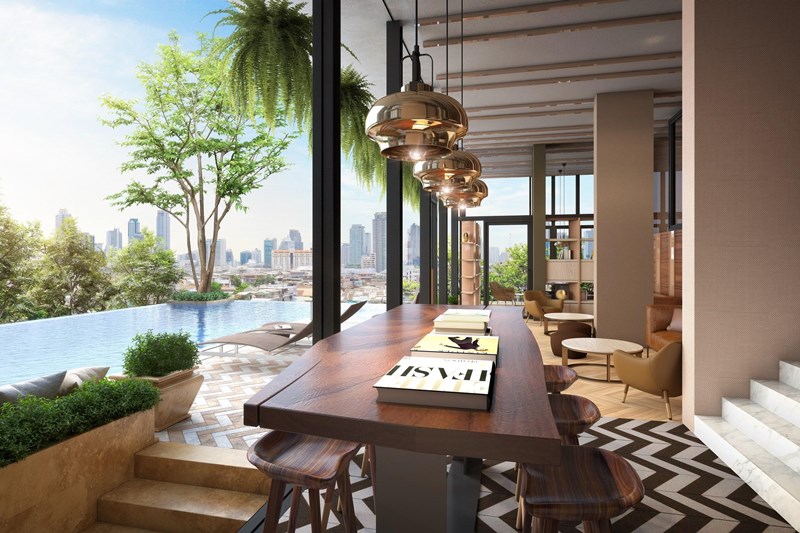 พื้นที่เชื่อมต่อกับสระว่ายน้ำจะประกอบด้วย Fitness, Library และ Co-Working Space ให้ลูกบ้านพักผ่อน พูดคุย นั่งทำงาน
