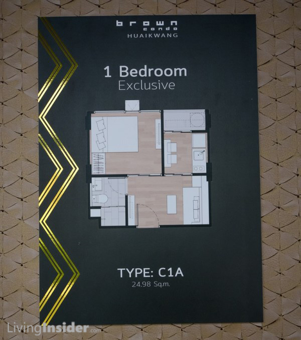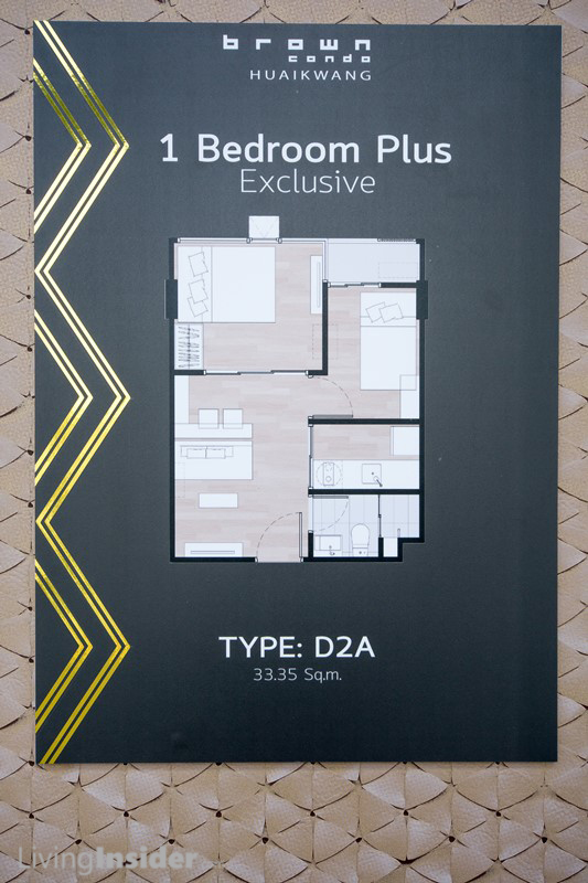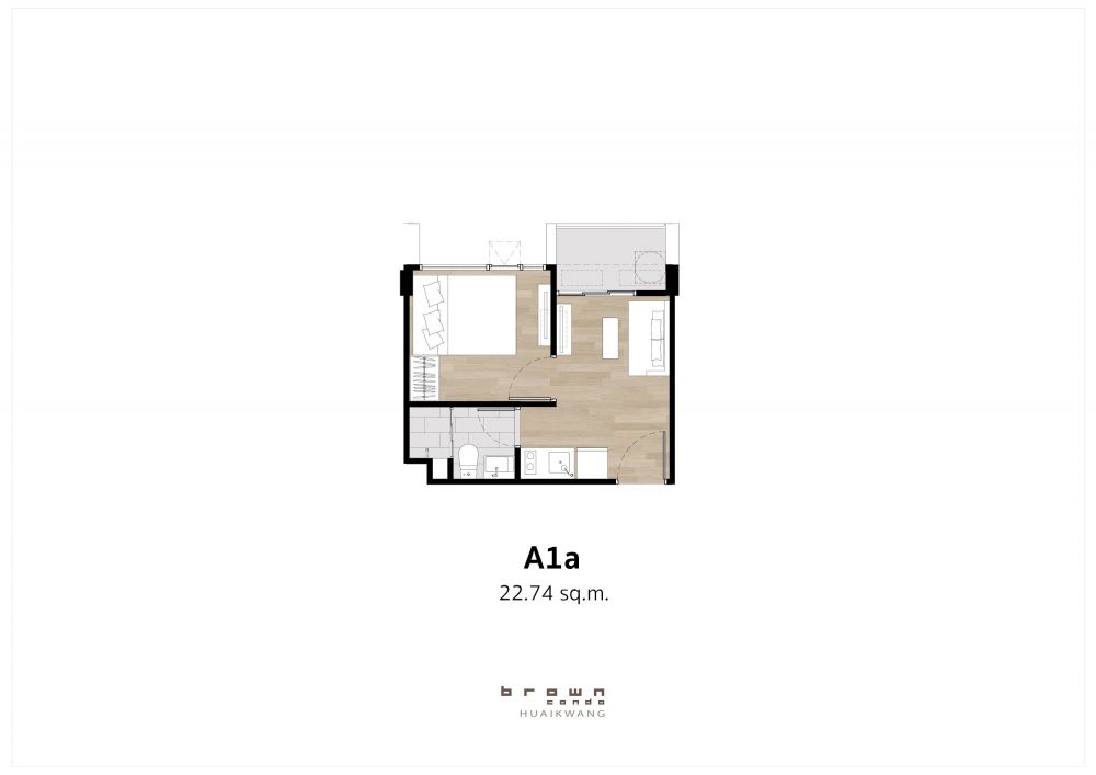 Brown Condo ห้วยขวาง มียูนิตให้เลือก 2 ประเภทคือ 1-Bedroom และ 1-Bedroom Plus Layout ออกแบบค่อนข้างลงตัว ตั้งแต่ 1-Bedroom ขนาดเล็กสุด (22.74 ตรม.) กั้นห้องนอนแยกได้ด้วย เป็นข้อดีของห้องหน้ากว้าง
