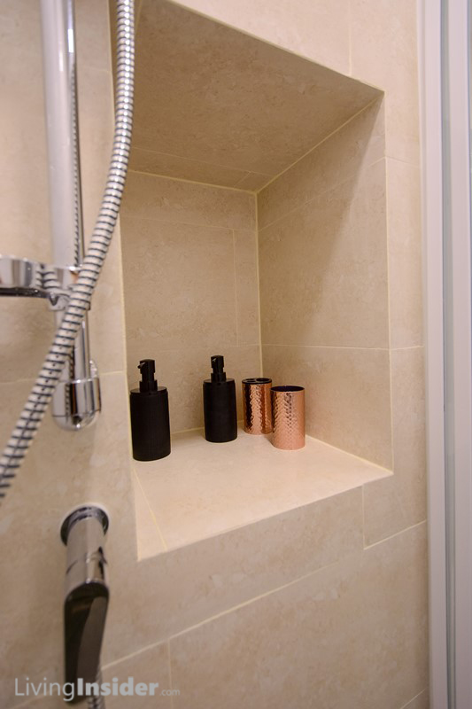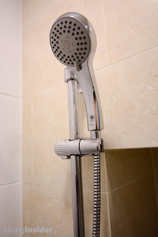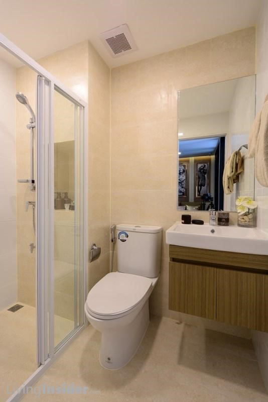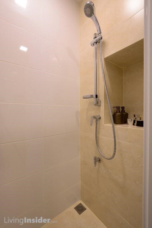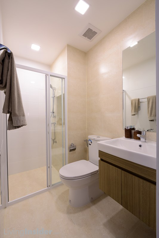 ห้องน้ำสุขภัณฑ์ตามมาตรฐาน อ่างล้างหน้ามีตู้เก็บของด้านล่าง พร้อมฉากกั้นอาบน้ำแบบประตูเลื่อน และช่องเซาะผนังสำหรับวางของใช้ส่วนตัว