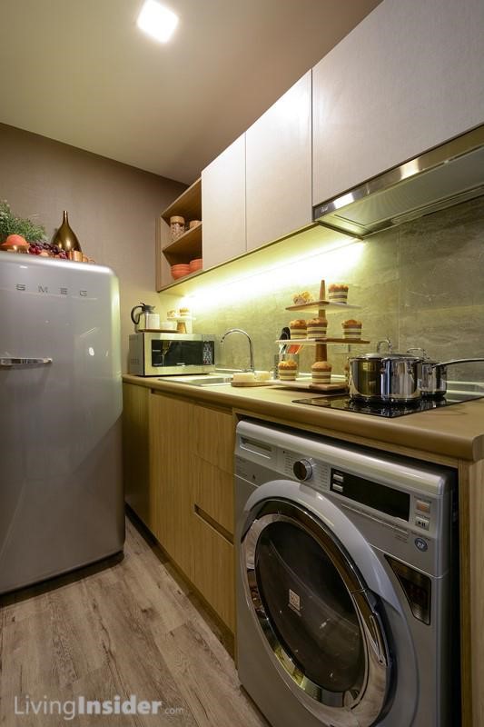 ครัวมีประตูกั้นสัดส่วนเช่นกัน Pantry ครัวบิวท์อินยาวไปกับผนัง มีพื้นที่เตรียมอาหาร เก็บของมากขึ้น พร้อมพื้นที่วางเครื่องซักผ้า (ฝาหน้า) และตู้เย็น 2 ประตูขนาดกลาง