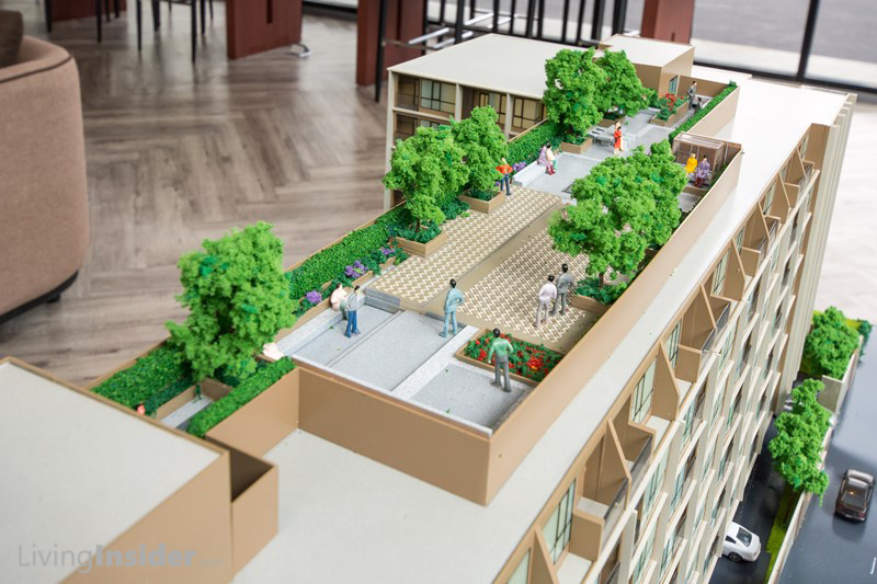 ขึ้นมาชั้นดาดฟ้า (Roof Top) มี WIFI FREE พบกับสวน French Garden, Putt Golf Lane, ปิ้งย่าง BBQ พร้อม Co-Working Space กลางแจ้ง และม้านั่งพักผ่อน ถือว่าจัดเต็มจริงๆ ครับ แม้พื้นที่โครงการจะมีขนาดไม่ใหญ่นัก