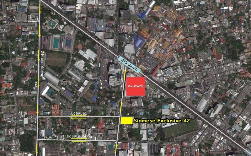 ขอพูดถึงโลเคชั่นกันก่อน ตามชื่อครับ Siamese Exclusive 42 อยู่ในซอยสุขุมวิท 42 สำนักงานขายอยู่หน้าโครงการ ซึ่งอนาคตปรับปรุงเป็นพื้นที่สวน หลังโครงการแล้วเสร็จ แม้เป็นถนน One-Way แต่สามารถเข้าซอยสุขใจ ลัดออกสุขุมวิท 40 ไปถนนพระราม 4 หากมาจากสุขุมวิท ให้เลี้ยวเข้าซอย 40 > ซอยสมานฉันท์ > สุขุมวิท 42 เข้าโครงการ (ตามภาพ) ภาพรวมเดินทางไม่ยากครับ หากขับรถส่วนตัว