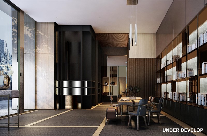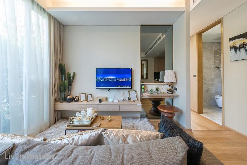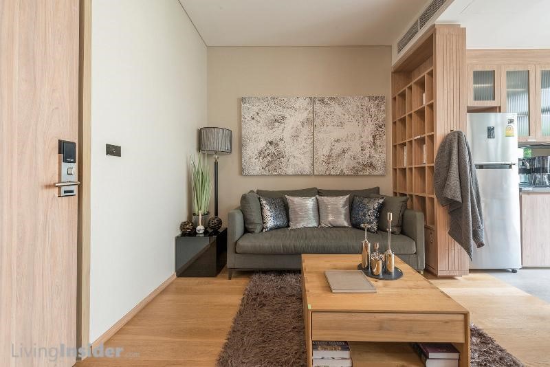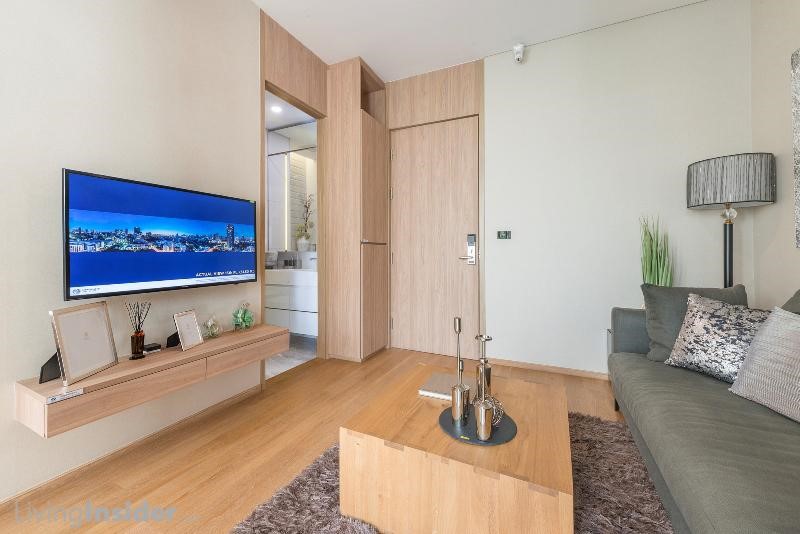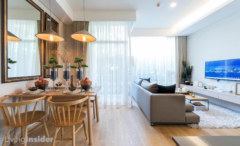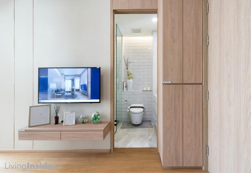 ห้องตัวอย่างแต่งสไตล์ Modern Japanese ใช้โทนสีอบอุ่น ส่วนนั่งเล่นวางโซฟาขนาด 2-3 ที่นั่ง โต๊ะกลาง บิวท์อินชั้นวางทีวี และตู้เก็บของอเนกประสงค์หน้าประตู เครื่องปรับอากาศแบบ Concealed บนฝ้าผนัง
