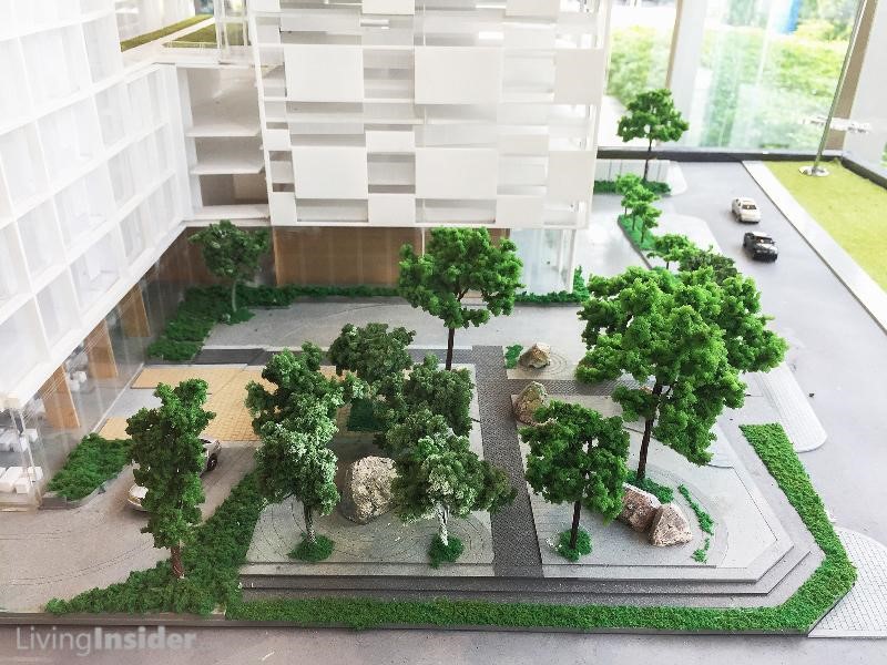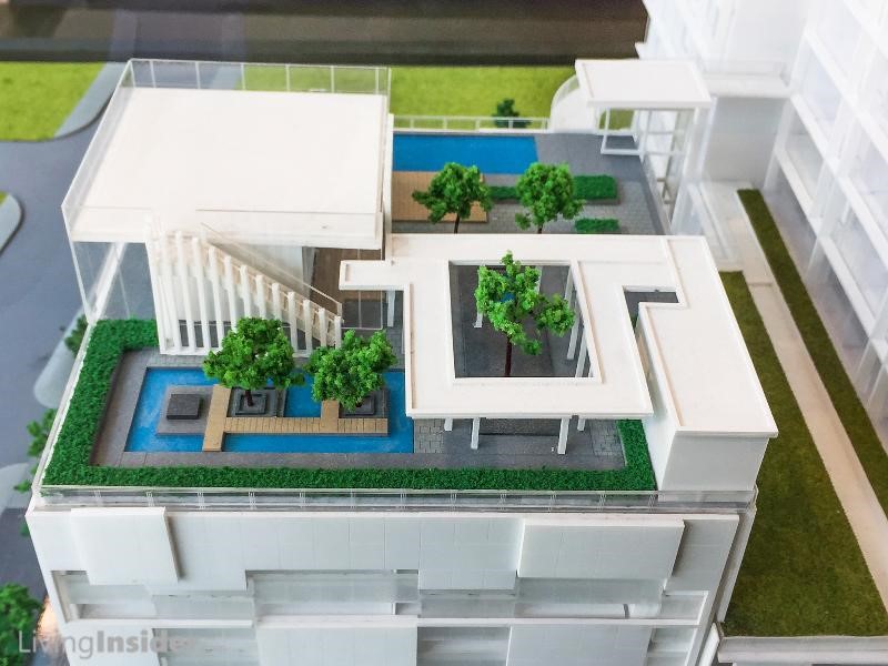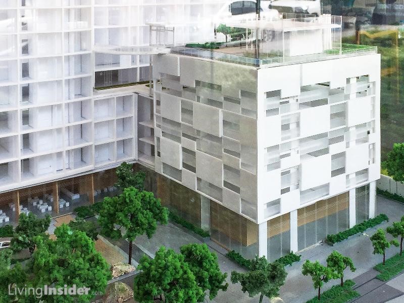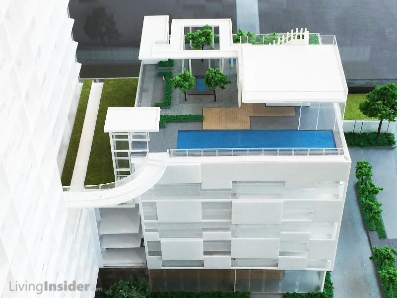 สังเกตด้านหน้ามีอาคารแยกต่างหาก เป็นส่วนอาคารจอดรถอัตโนมัติ (175 คัน) ดาดฟ้าคือส่วนกลาง (พื้นที่สวน , สระว่ายน้ำ) ของยูนิตเช่าระยะสั้น ตรงนี้ทาง Siamese Asset บริหารพื้นที่เอง หากลูกบ้านมาใช้งานอาจมีค่าใช้จ่ายเพิ่ม
