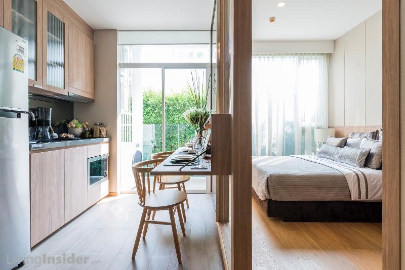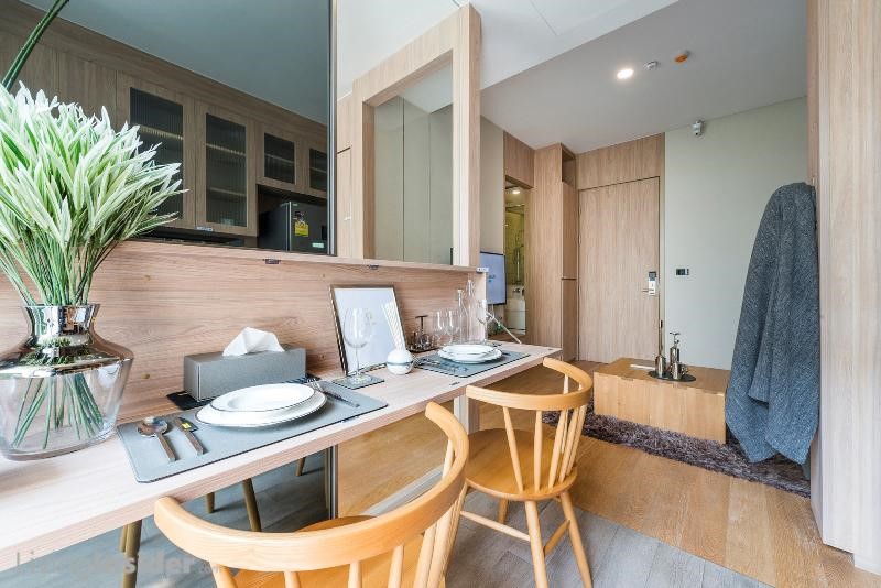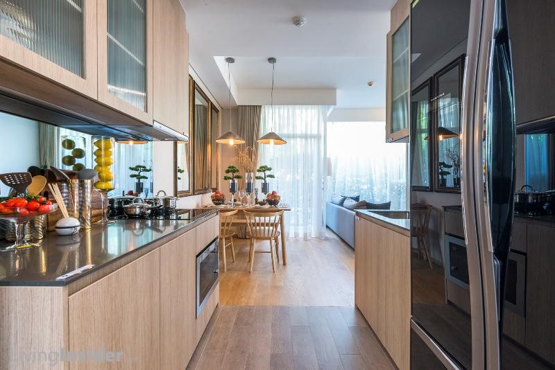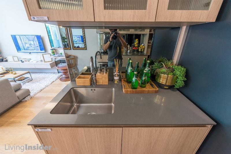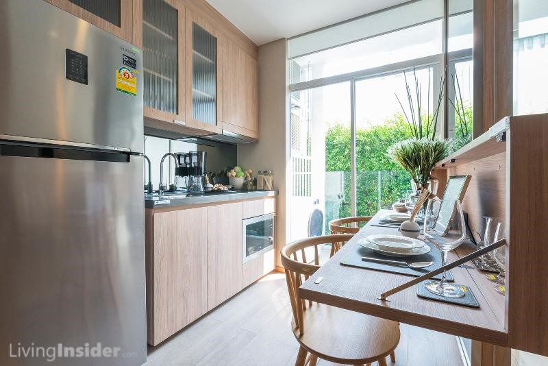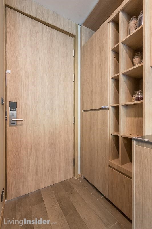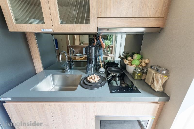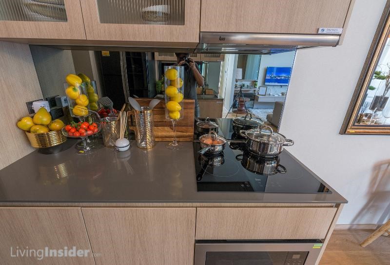 เปิดห้องเข้ามาเจอตู้เก็บของอเนกประสงค์ พื้นที่ครัวแบ่งเป็น 2 ฝั่ง สามารถเตรียมอาหารสะดวก เก็บของได้มากกว่าเดิม มาพร้อมเตาไฟฟ้า 2 หัว, เครื่องดูดควัน, ซิงค์ล้างจาน แบบเดียวกับยูนิต 1-Bedroom