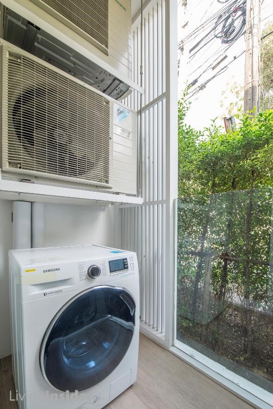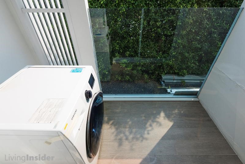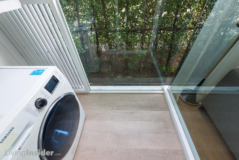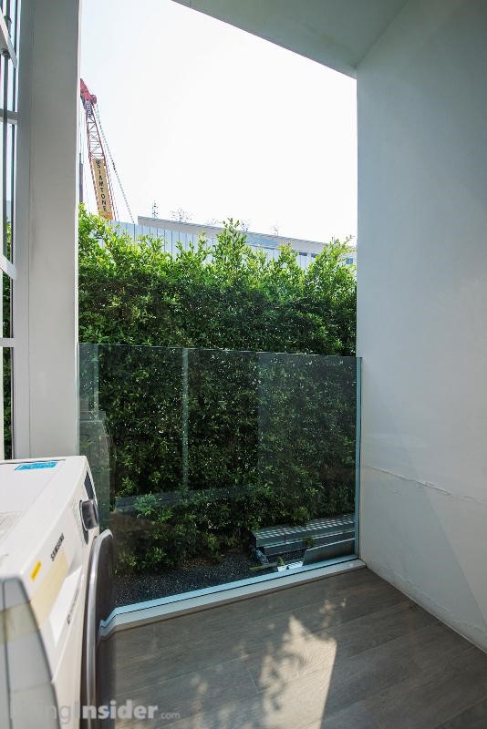 พื้นที่ระเบียง วางเครื่องซักผ้า พอวางเก้าอี้ไว้ชมวิว สูดอากาศภายนอกได้