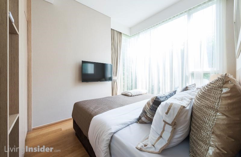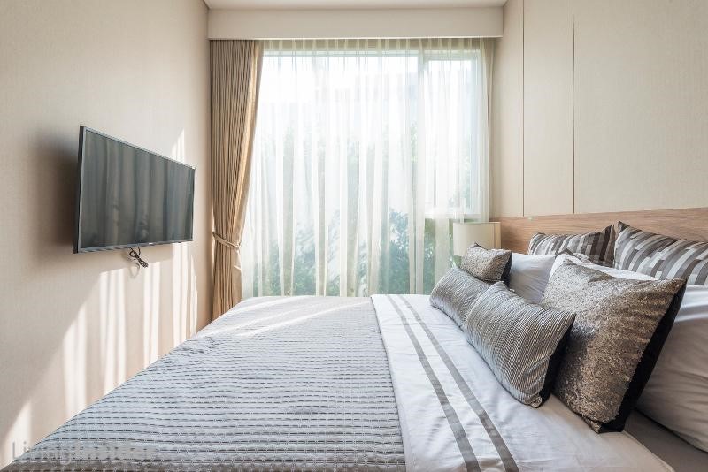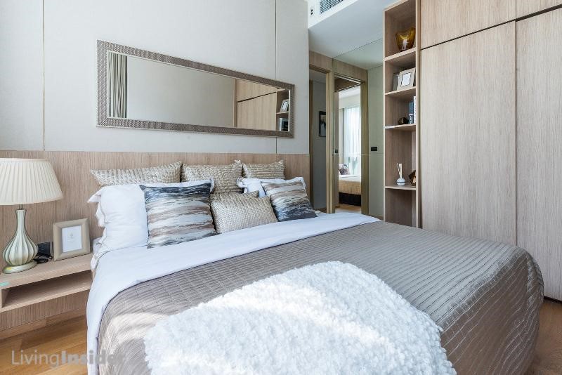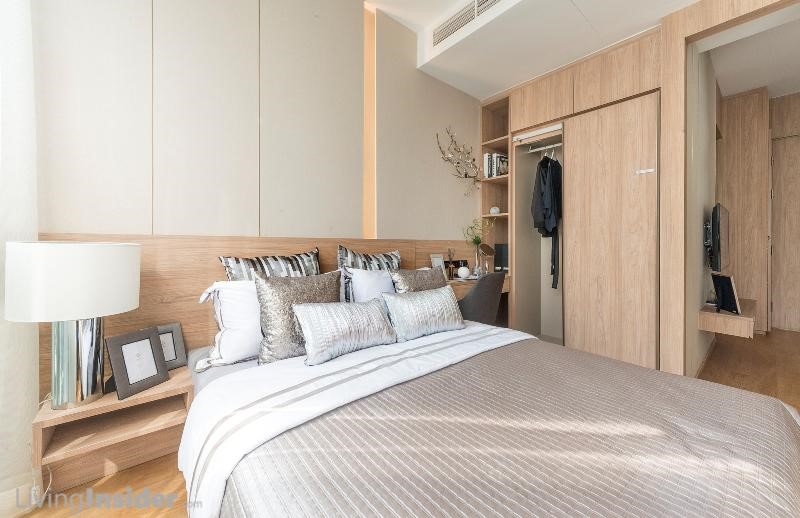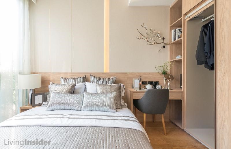 ห้องนอนหลัก วางเตียงขนาด 5 ฟุต บิวท์อินตู้เสื้อผ้า โต๊ะข้างเตียง สามารถติดตั้งทีวีแขวนผนังเพิ่มตามต้องการ