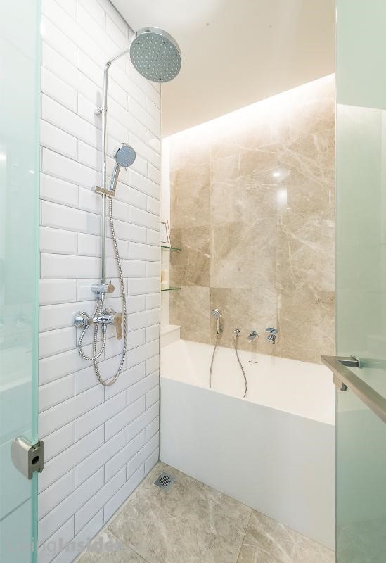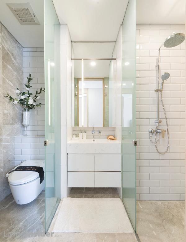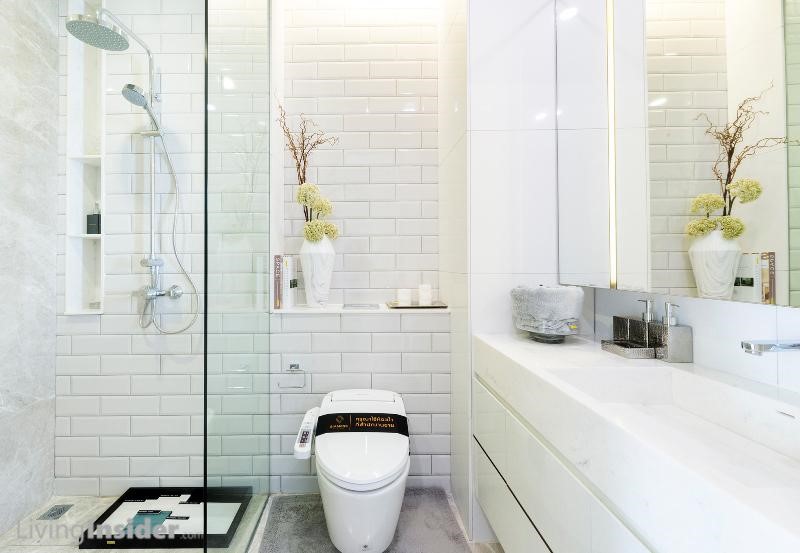 ห้องน้ำ สามารถเข้าได้จากส่วนกลางห้อง ส่วนแห้งมีสุขภัณฑ์ให้แบบเดียวกับ 1-Bedroom ส่วนอาบน้ำให้ Rain Shower พร้อมอ่างแช่ตัว หากคุณปล่อยเช่าชาวญี่ปุ่นรับรองถูกใจครับ