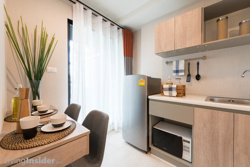 ห้องครัวจัดแยกออกจากพื้นที่ห้องนั่งเล่นเป็นสัดส่วน ทำให้เวลาทำอาหารกลิ่นไม่รบกวน นอกจากนี้ยังเชื่อมต่อกับส่วนระเบียงซึ่งสามารถเปิดระบายอากาศได้ด้วย