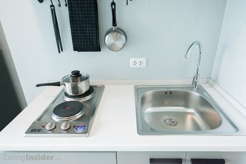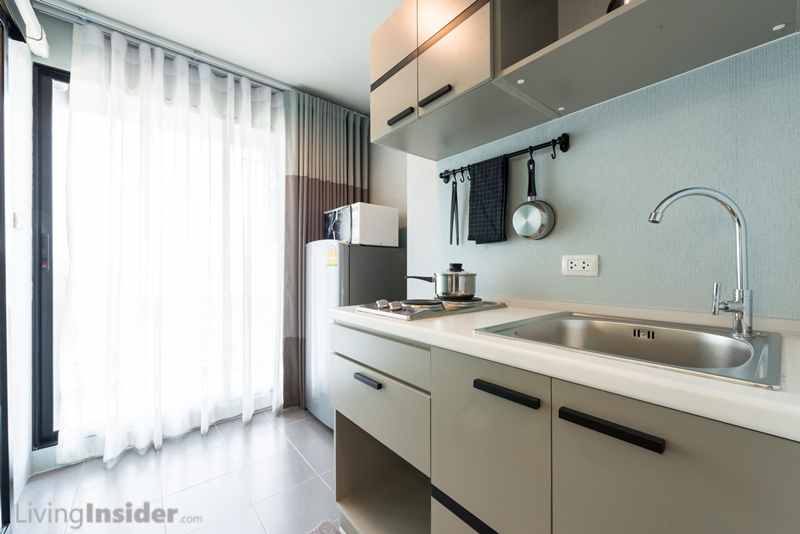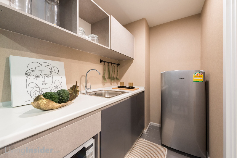 ส่วนห้องครัว กั้นแยกเป็นครัวปิดเพื่อป้องกันไม่ให้กลิ่นอาหารเข้ามาถึงห้องนั่งเล่น