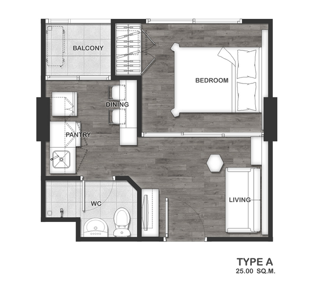 ห้องขนาด 30 ตารางเมตร ขนาดใหญ่ที่สุดและมีการจัดวางฟังก์ชั่นแตกต่างจาก Type อื่น จุดเด่นที่ผมชอบมากของห้องนี้คือ Multi-Functional room ที่เหมือนเป็นหัวใจที่เชื่อมไปยังทุกอิริยาบทของห้อง และตำแหน่งระเบียงที่รับแสงและวิวธรรมชาติได้อย่างเต็มอิ่ม เรียกได้ว่าอยู่ห้องได้ทั้งวันไม่มีเบื่อเลยครับ ที่สำคัญกว้างพอสำหรับ New Family พ่อ แม่ และลูกเล็ก อีกด้วย
