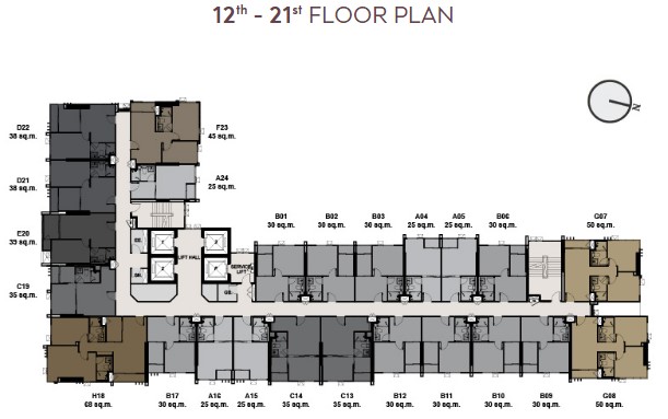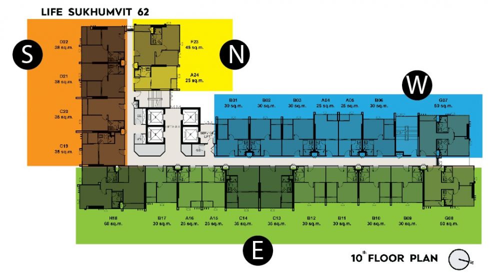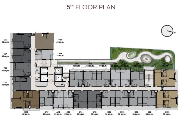 หน้าโครงการหันไปทางทิศใต้ โซนพักอาศัยอยู่ระหว่างชั้น 5 ถึง 22 โดย Floor Plan ของแต่ละชั้นจะคล้ายคลึงกัน Facility หลักอยู่บน Rooftop ชั้น 23 และ 24 อีกทั้งมี Private Garden อยู่กลางตึกบริเวณชั้น 5