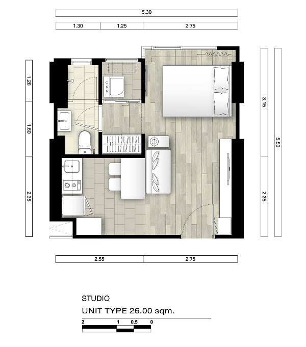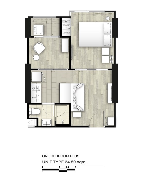 Layout นำจุดเด่นของยูนิต Studio และ 1-Bedroom เข้าด้วยกัน แถมห้องอเนกประสงค์ ทำเป็นห้องทำงาน / ห้องเก็บของ หรือห้องนอนชั่วคราวก็ดี เหมาะกับอาศัย 1-2 คน พื้นที่ใช้สอยมากทีเดียวครับ
