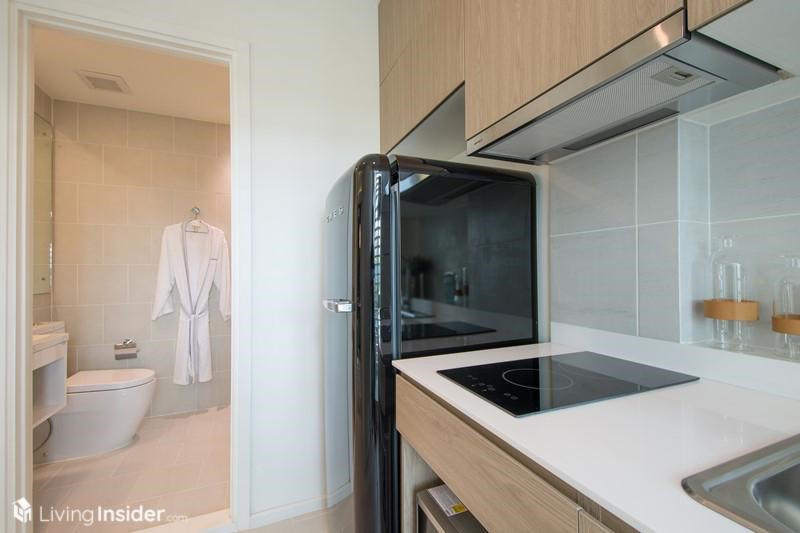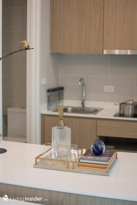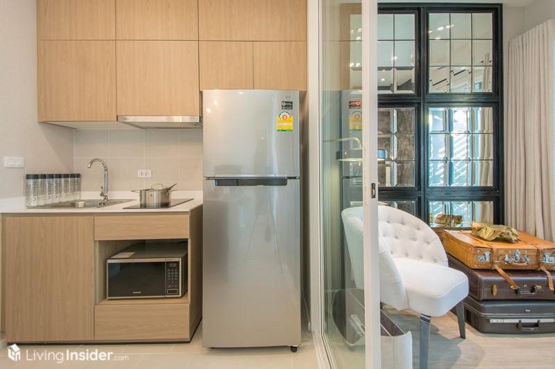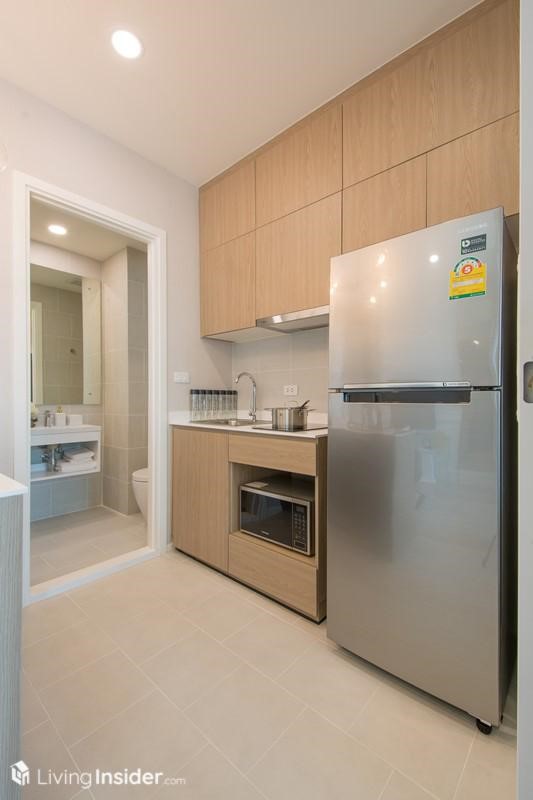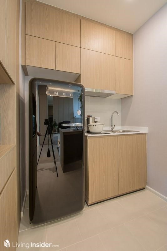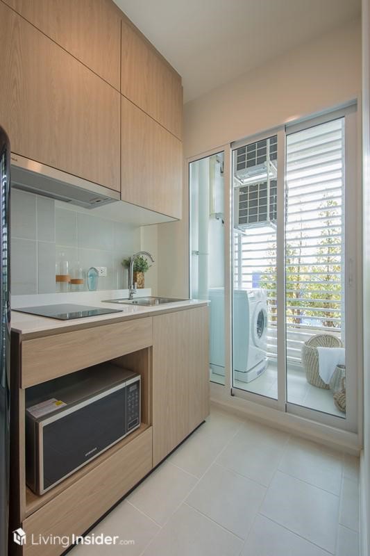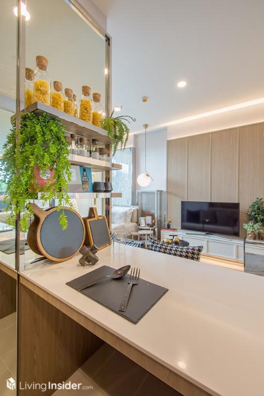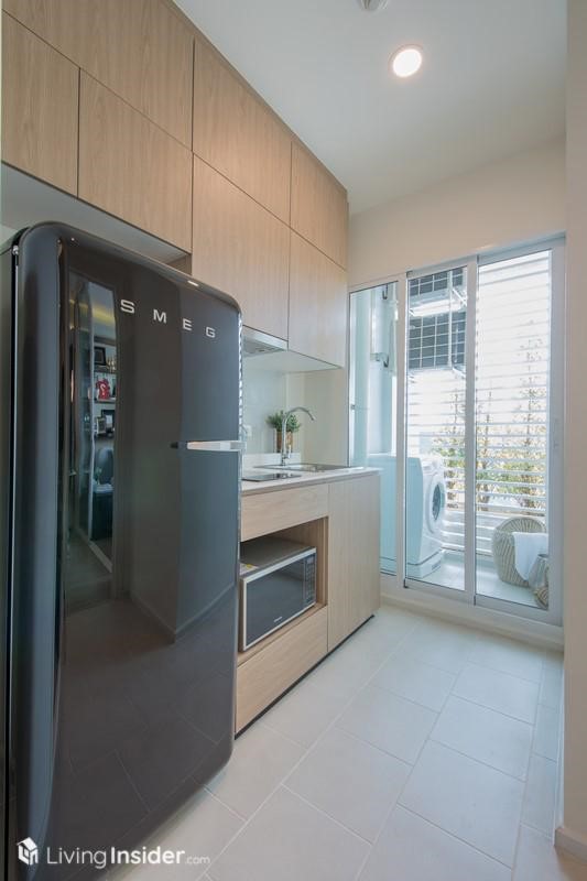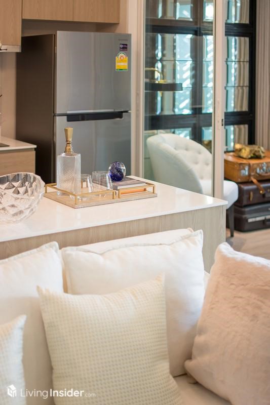 ฝั่งซ้ายมือเป็นพื้นที่ครัว Kitchen Island คล้ายยูนิต Studio พื้นที่ค่อนข้างเล็ก เหมาะกับอุ่นอาหาร / ทำของกินเล็กน้อยมากกว่า บิวท์อิน Pantry - เคาน์เตอร์อเนกประสงค์ เว้นพื้นที่สำหรับไมโครเวฟ, ตู้เย็นขนาด 2 ประตู