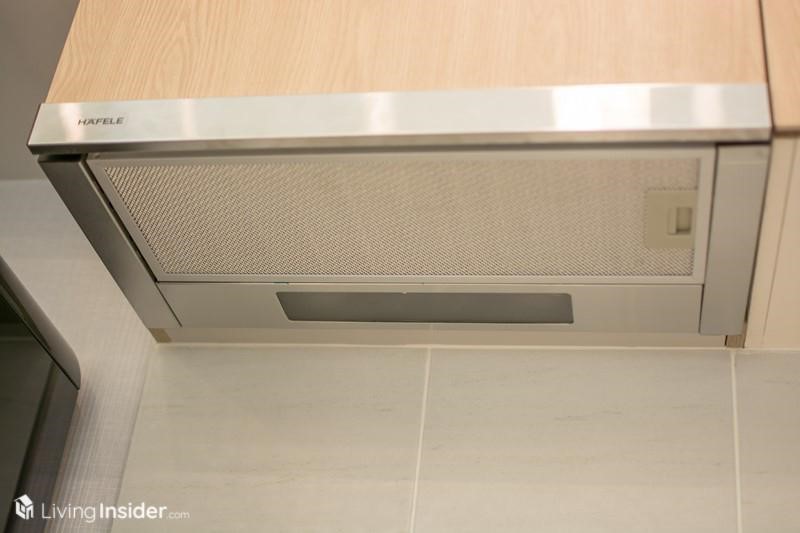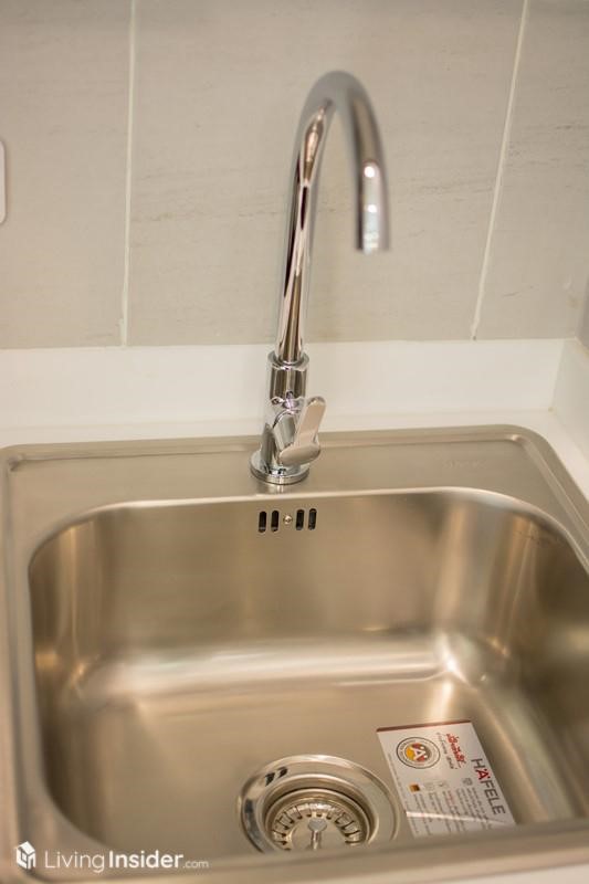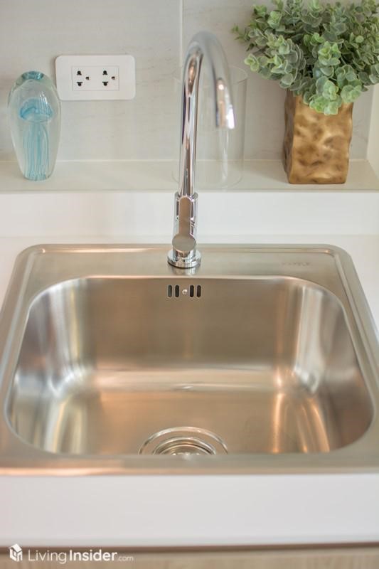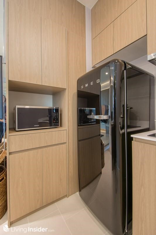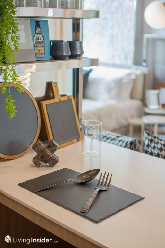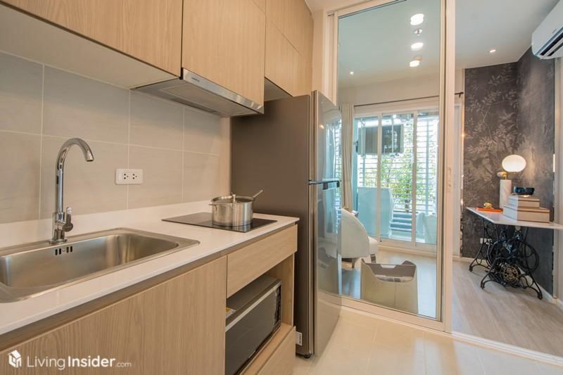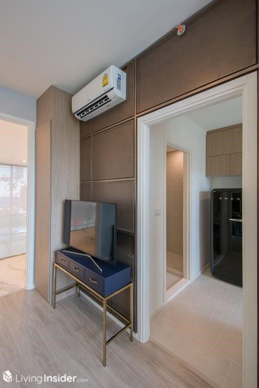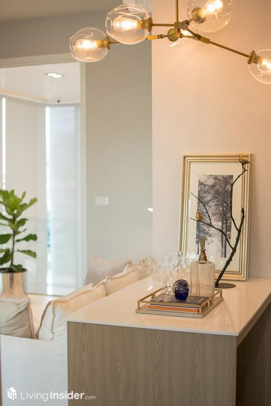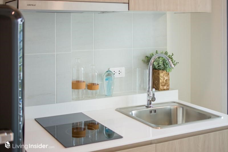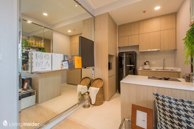 ฝั่งซ้ายมือเป็นพื้นที่ครัว Kitchen Island คล้ายยูนิต Studio พื้นที่ค่อนข้างเล็ก เหมาะกับอุ่นอาหาร / ทำของกินเล็กน้อยมากกว่า บิวท์อิน Pantry - เคาน์เตอร์อเนกประสงค์ เว้นพื้นที่สำหรับไมโครเวฟ, ตู้เย็นขนาด 2 ประตู