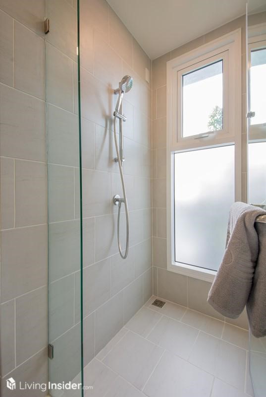 ห้องน้ำค่อนข้างกว้างทีเดียว จัดวางสุขภัณฑ์พื้นฐานครบ กั้นส่วนเปียก-แห้ง พร้อมหน้าต่างบานกระทุ้ง สำหรับเปิดระบายอากาศ