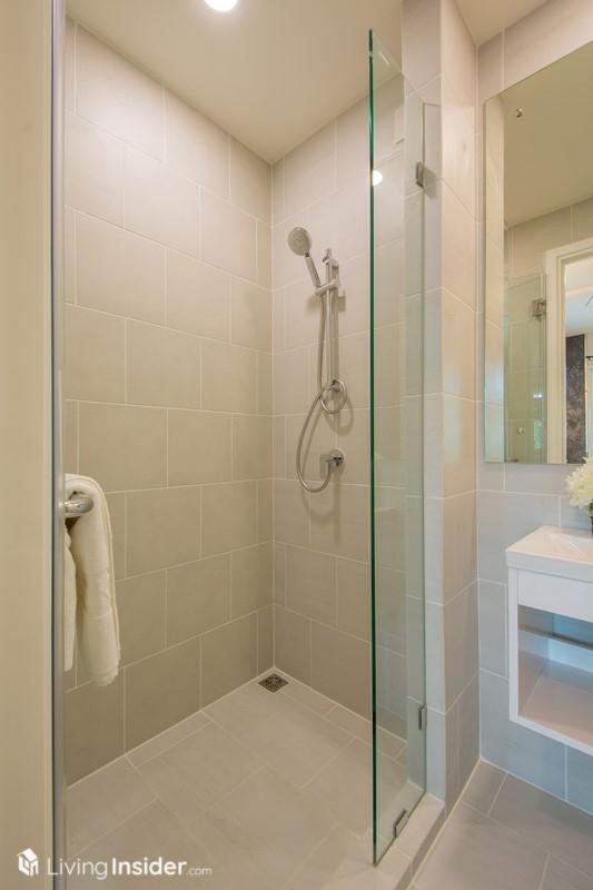 ห้องน้ำทำมาลงตัวเหมือนกัน สุขภัณฑ์ครบ เว้าผนังวางของใช้ส่วนตัว กั้นฉากกระจกนิรภัยส่วนเปียกให้