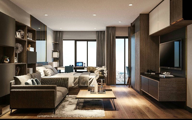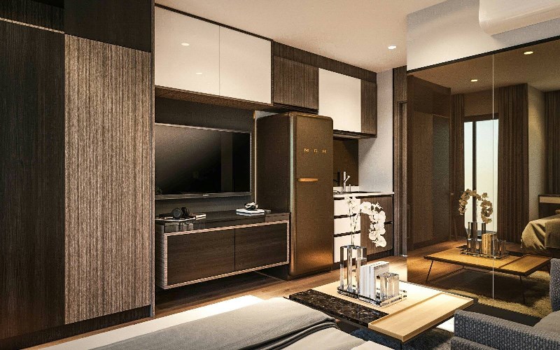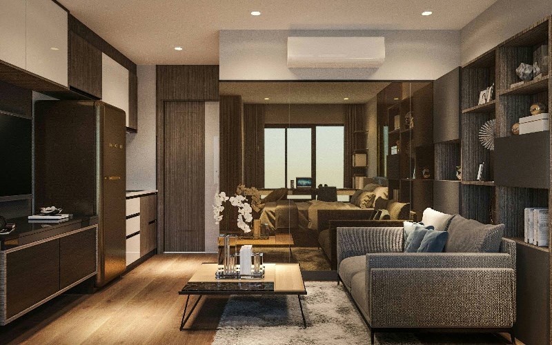 ห้อง Studio แต่งสีธรรมชาติ แบบครัวเปิด ทำให้ไม่สูญเสียพื้นที่ภายในห้องเพื่อเป็นผนังกั้น นอกจากจะทำให้ห้องโปร่งขึ้นแล้ว ยังทำให้เรามีพื้นที่ใช้สอยเพื่อจัดวางเฟอร์นิเจอร์ที่จำเป็นเพิ่มขึ้นอีกด้วย สามารถวางทีวี ตู้เย็น ตู้เสื้อผ้า ชั้นวางของ โซฟา โต๊ะเขียนหนังสือ และโต๊ะอาหาร ได้อย่างสบาย ห้องไม่ดูแน่นเลย