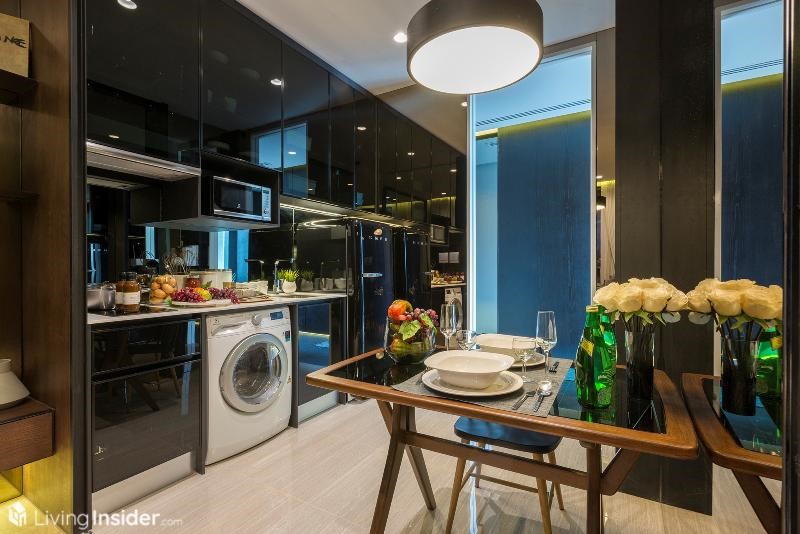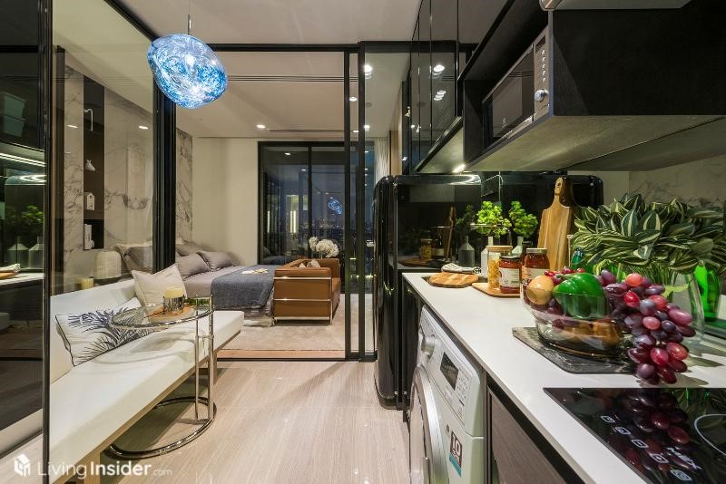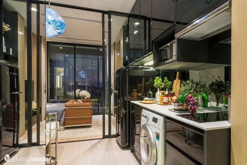 เปิดเข้ามาพบกับพื้นที่ครัว มีประตูบานสไลด์ 3 ตอน กั้นสัดส่วน สามารถทำอาหารได้ บานประตูที่ทางโครงการให้เป็นระบบ Digital door lock รวมทั้งระบบ Home Automation ครับ