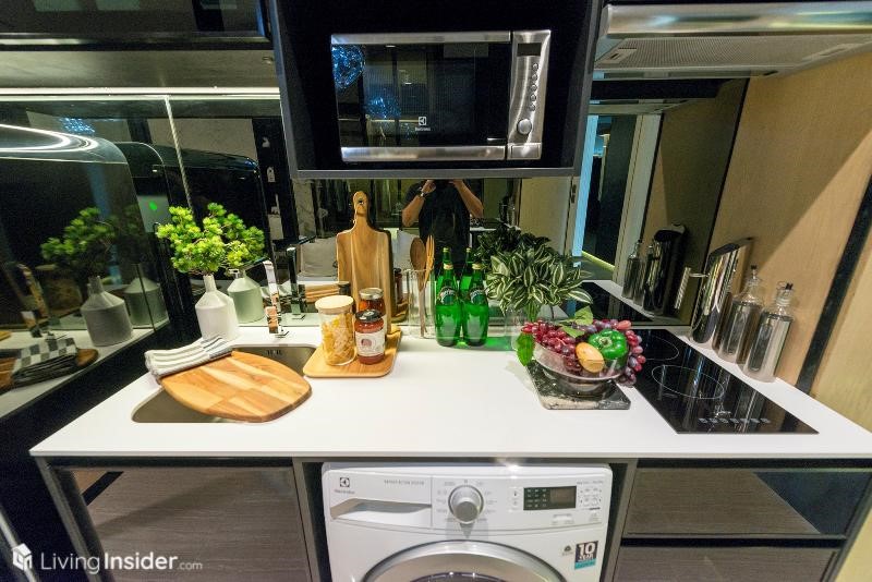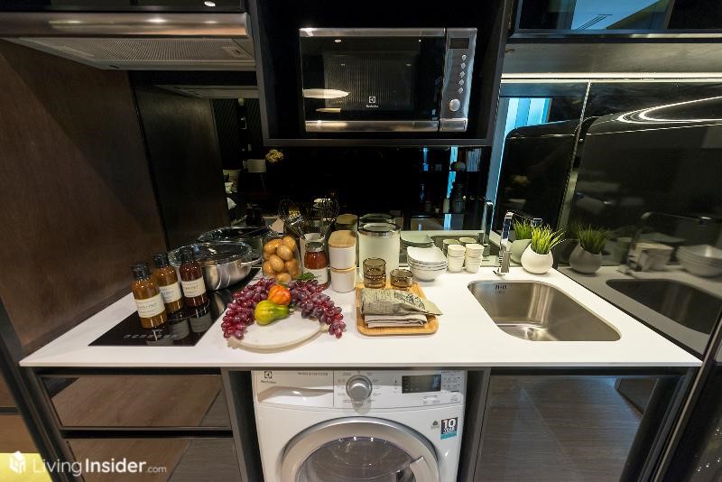 เคานเตอร์ครัวบิวท์อิน Pantry วัสดุ Top หินสังเคราะห์ ตู้เก็บของหน้าบานกระจก ซิงค์ล้างจานขนาดกำลังพอดี พร้อมเตาไฟฟ้า - เครื่องดูดควัน เว้นพื้นที่วางไมโครเวฟ - เครื่องซักผ้า และตู้เย็น 2 ประตู พื้นห้องบริเวณห้องครัวจะเป็นหินแกรนิตโต้ครับ