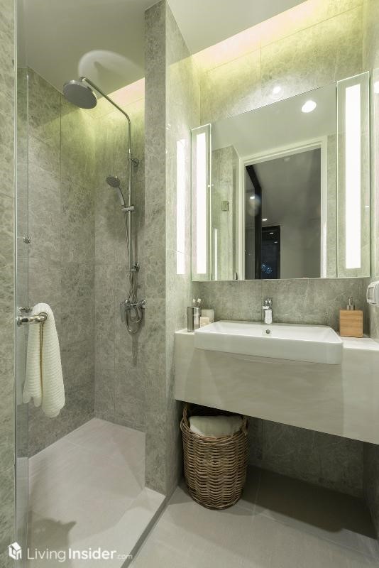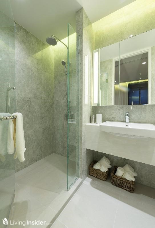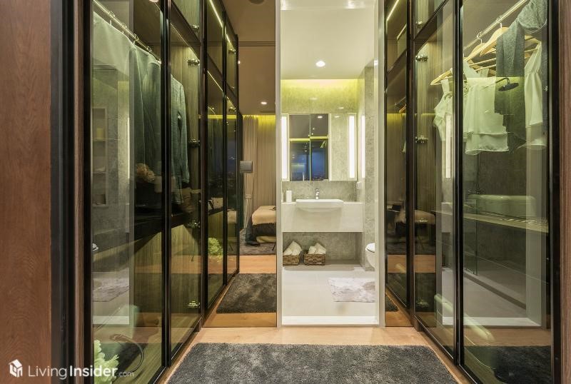 ด้านในคือห้องน้ำ ปูกระเบื้องสวยงามผนังเป็นแกรนิตโต้ทั้งหมด เคาน์เตอร์อ่างหินสังเคราะห์ กั้นส่วนเปียก-แห้งด้วยประตูกระจก พร้อมฝักบัวแบบ Rain Shower กระจกแต่งหน้า สามารถเก็บของด้านในได้ รวมทั้งโถชักโครกที่ทางโครงการให้จะเป็นแบบ อัตโนมัติ สำหรับเครื่องสุขภัณฑ์ภายในห้องน้ำ ทั้งหมดเป็นของ KOHLER