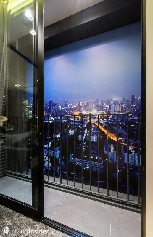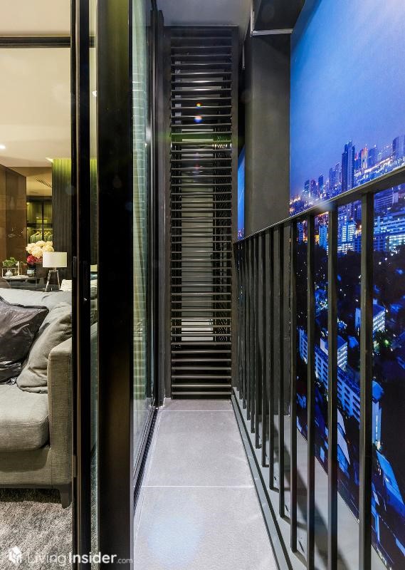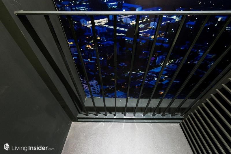 ระเบียงขนาดกำลังดี ตรงกลางกันพื้นที่สำหรับแขวนคอมเพรสเซอร์แอร์ อีกด้านเป็นระเบียงห้องนอน