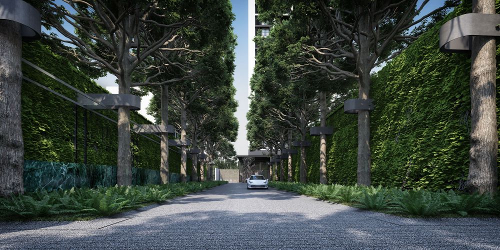 เริ่มต้นด้วยทางเข้าสู่ตัวอาคารที่ออกแบบให้เป็น BOTANICAL PATH ทิวต้นไม้สูง 2 ข้างทาง ขนาบทางเข้าสู่ตัวอาคาร ดึงดูดสายตาและให้ความร่มรื่นตลอด 50 เมตร ทำให้ผู้พักอาศัยหลีกหนีความวุ่นวายจากความเป็นเมืองหลวง เข้าความร่มรื่นย์ของคอนโดในป่าที่ไม่เหมือนใคร