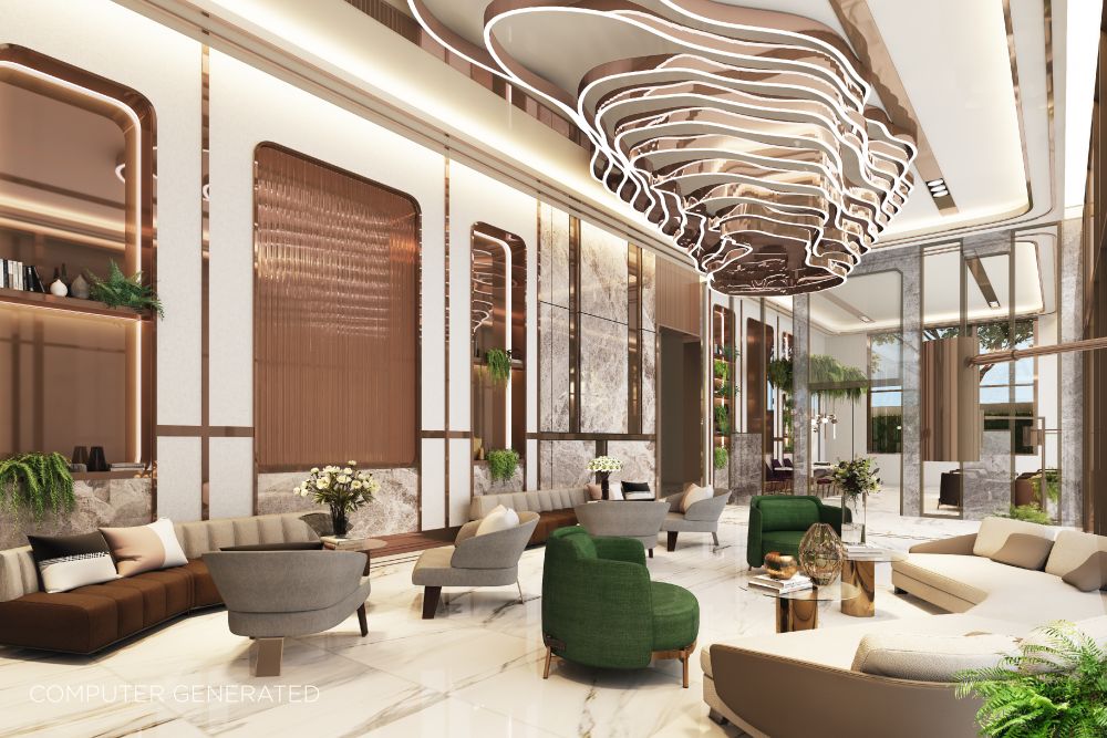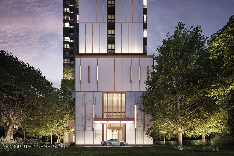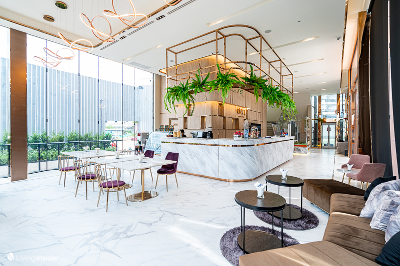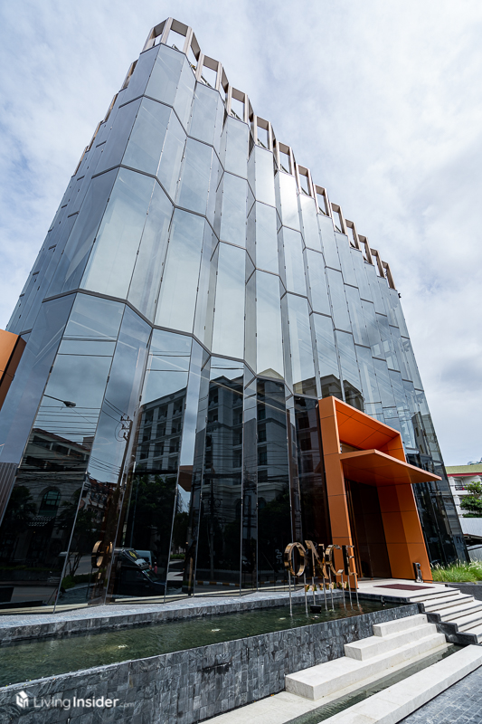 สำหรับสไตล์การออกแบบตกแต่งก็ไม่ต้องเป็นห่วง เนื่องจากได้สถาปนิกมืออาชีพของประเทศสิงคโปร์เป็นผู้ดีไซน์ เพื่อให้ได้มาตรฐานและออกมาสวยงามลงตัวมากที่สุด มาเริ่มดูกันที่ส่วนกลางก่อนเลย ตั้งแต่หน้าทางเข้าจุด Drop off เห็นเส้นสายสีทองแดงของตัวอาคารชัดเจน มีความหรูหราเบาๆ