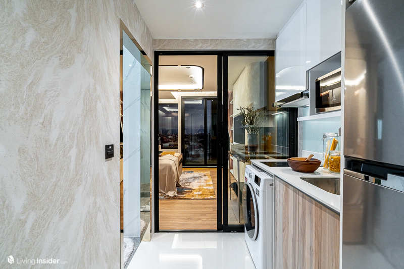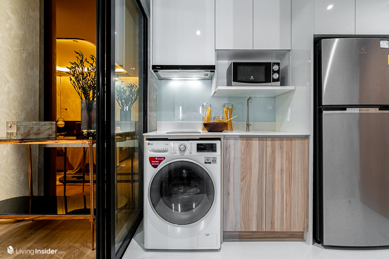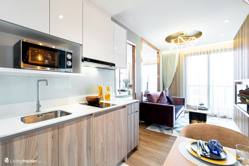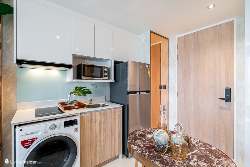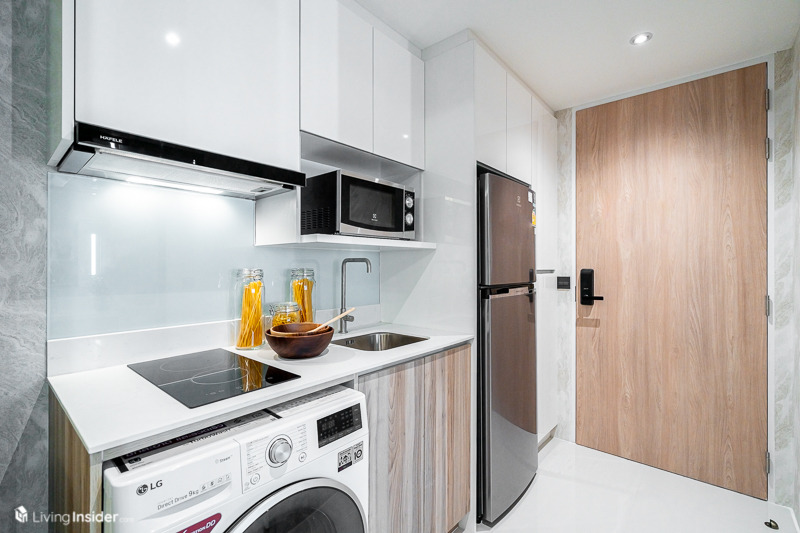 โดยทางโครงการมีห้องตัวอย่างให้ดูถึง 3 แบบ เดี๋ยวเราจะพาไปชมครบทุกแบบกันเลย เริ่มที่ Studio ขนาด 28.60 ตร.ม. เปิดประตูเข้ามาทางขวามือจะเจอส่วนของ ห้องครัว ซึ่งสิ่งที่เราเห็นทางโครงการให้เกือบทุกอย่างจริงๆ ตั้งแต่ตู้เก็บของเก็บรองเท้าที่บิวท์มาสุดเพดาน