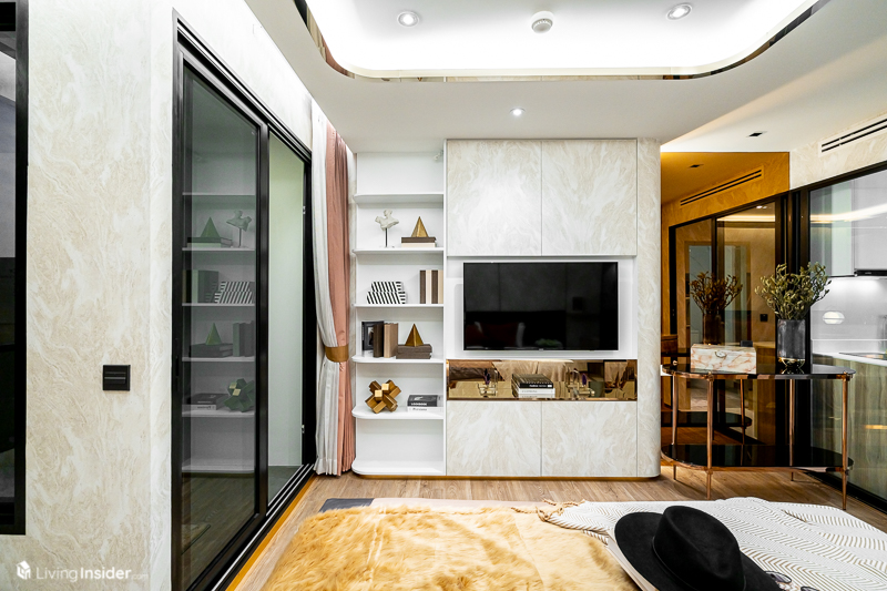 ก่อนจะไปถึงห้องถัดไปจะมีประตูกระจกใสบานเลื่อนแบบ 2 ตอนกั้นไว้ชั้นหนึ่งซึ่ง ห้องนั่งเล่น จากพื้นถึงฝ้าสูง 2.7 ม. ฝั่งหนึ่งเป็นชั้นวางทีวีบิวท์อินมาให้คุ้มสูงติดเพดาน และมีพื้นที่เหลือสำหรับวางโต๊ะไว้นั่งกินข้าวหรือทำงาน