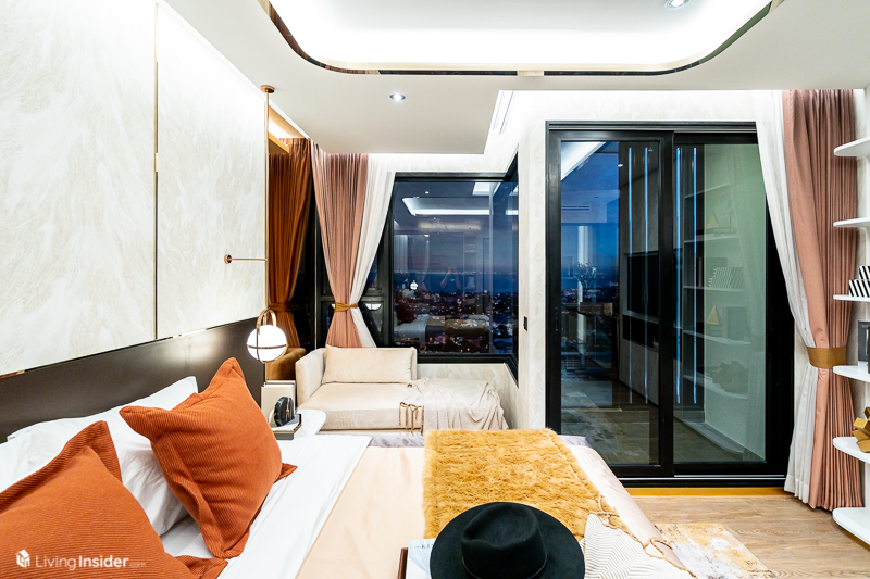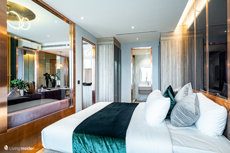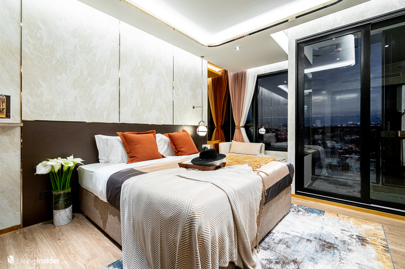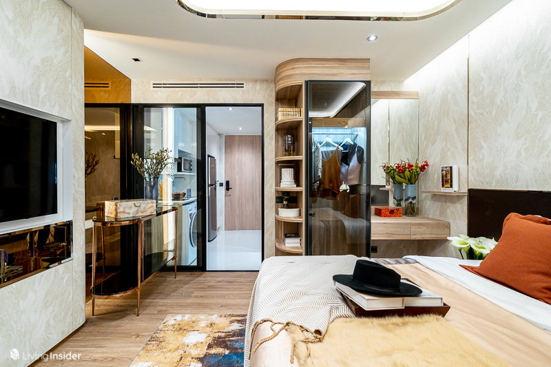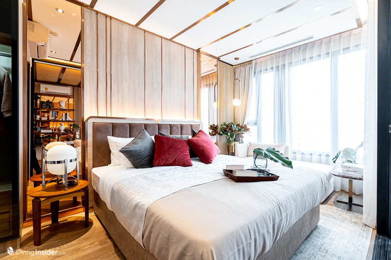 อีกฝั่งเป็นที่นอนพร้อมวางเตียงขนาด 6 ฟุต แต่ก็ไม่ได้ทำให้ห้องดูเล็กลงแต่อย่างใด เพราะยังมีพื้นที่ให้วางตู้เสื้อผ้าและโต๊ะเครื่องแป้งแบบไม่อึดอัด