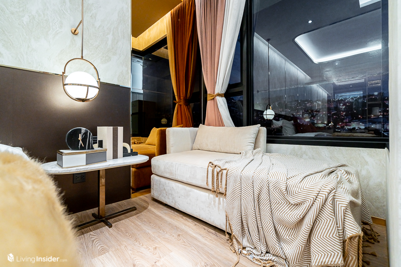 ด้านในสุดเป็น มุมสำหรับนั่งเล่น พร้อมเดย์เบดที่ทางโครงการเตรียมไว้ให้แล้วติดกับกระจกเข้ามุมบานใหญ่ทำให้ห้องดูกว้างขึ้น และไว้ให้เรานั่งมองวิวข้างนอกเพลินๆ ติดกันเป็นระเบียงขนาดกะทัดรัดพอให้วางราวตากผ้าได้