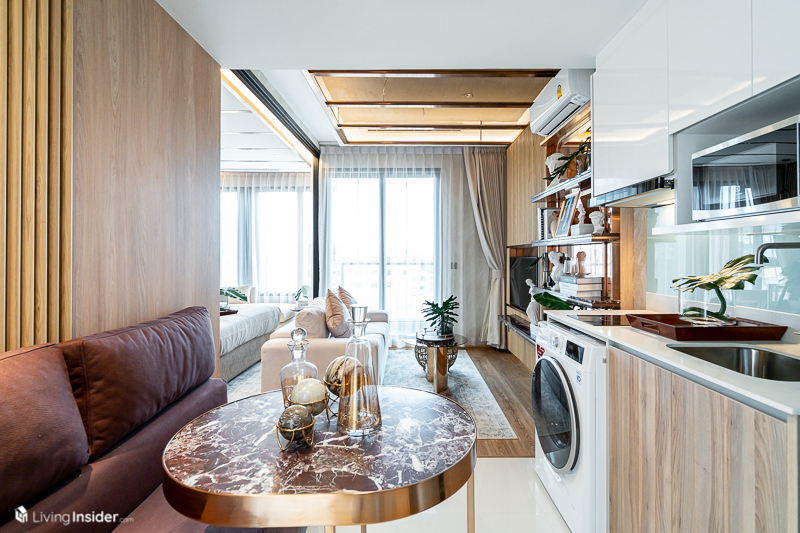 ไปดูอีกห้องกับ 1 Bedroom + 1 Bathroom ขนาด 34.40 ตร.ม. ซึ่งส่วนแรกที่เจอก็คล้ายกับห้อง Studio แต่มีขนาดใหญ่กว่าและ เป็นครัวเปิด การจัดวางของเคาน์เตอร์ไม่ต่างกันเพียงแต่ย้ายส่วนของตู้เก็บของเก็บรองเท้ามาอยู่อีกฝั่งแทน ด้านข้างเป็นพื้นที่สำหรับวางโซฟาขนาดเล็กหรือเก้าอี้และโต๊ะไว้นั่งกินข้าว