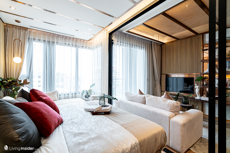และก็เข้าสู่ ห้องนอน ที่กั้นด้วยประตูกระจกใส วันไหนอยากให้ห้องกว้างกว่าเดิมก็แค่เปิดประตูให้ทั้งสองห้องเชื่อมกันแค่นั้นเอง โครงการให้เตียงคิงไซส์วางไว้กลางห้อง รวมถึงเดย์เบดและกระจกเข้ามุมที่ได้เหมือนกับห้องแรก