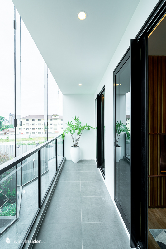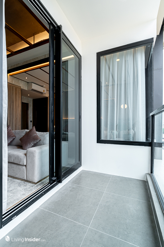 ตัวระเบียง ยาวเชื่อมต่อกันสองห้องคือห้องนั่งเล่นกับห้องนอนเล็ก ทำให้มีพื้นที่สำหรับวางเก้าอี้ไว้ชมวิวทิวทัศน์ยามค่ำคืน