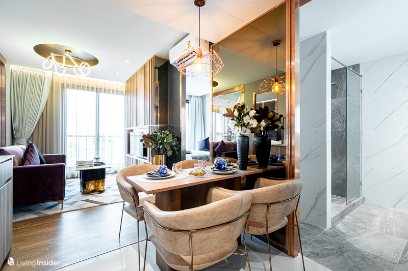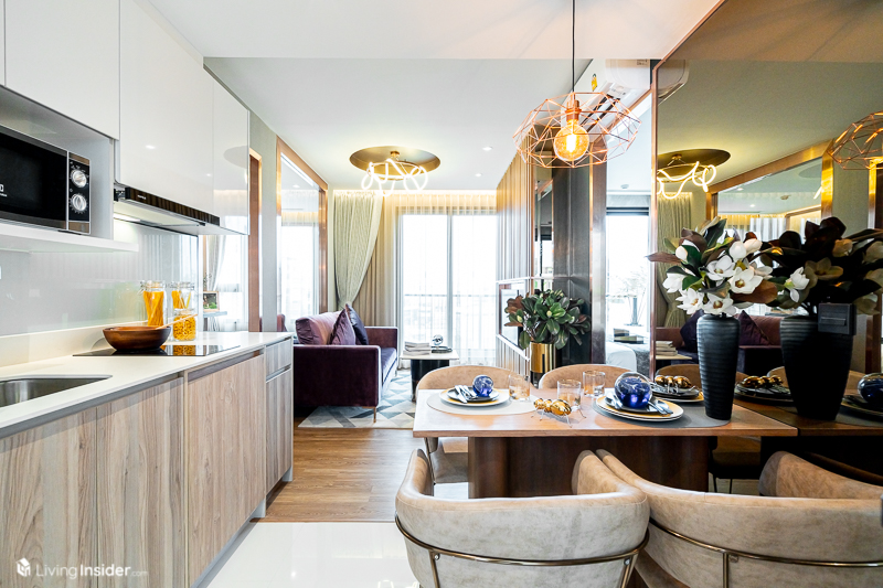 ห้องสุดท้ายคือ 2 Bedroom + 2 Bathroom ขนาด 58.50 ตร.ม. การจัดวางยังคงคล้ายกับ 1 ห้องนอน เห็นห้องครัว ก่อนแต่ได้เคาน์เตอร์ครัวยาวกว่าเดิม เพิ่มตู้เก็บของชั้นบนอีกหนึ่งตู้ ฝั่งตรงข้ามวางโต๊ะกินข้าวและเก้าอี้ได้ถึง 4 ที่นั่ง แน่นอนว่าโครงการก็มีให้เราเหมือนเดิม