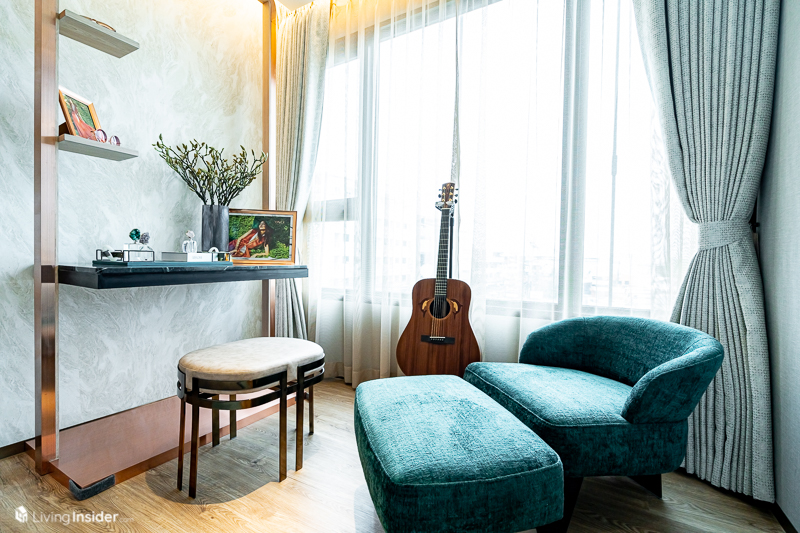ย้อนกลับไปที่ ห้องนอนใหญ่ ได้เตียง 6 ฟุต โต๊ะเครื่องแป้งวางไว้ติดริมหน้าต่าง ทำให้การแต่งหน้าเป็นเรื่องง่ายขึ้น และยังมีพื้นที่เหลือวางโซฟาเดี่ยวไว้นั่งเล่นก่อนเข้านอน