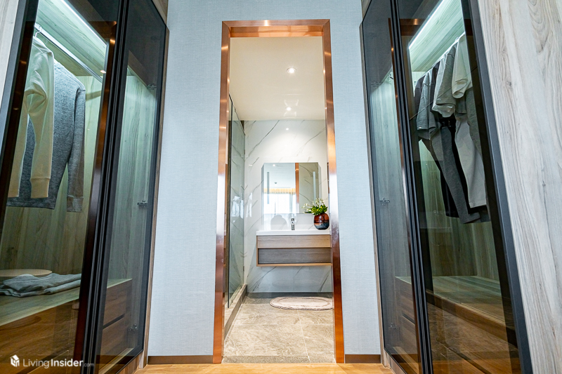 ส่วนตู้เสื้อผ้าเหมือนกับแบบ 1 ห้องนอน มีทั้งสองฝั่งก่อนทางเข้าห้องน้ำ มีอ่างล้างหน้า กระจกติดไฟ โถสุขภัณฑ์ Rain Shower กั้นด้วยกระจกนิรภัยแยกสัดส่วนชัดเจน