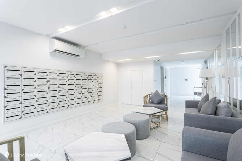 Main Lobby บริเวณอาคาร A ตกแต่งโทนสีเทาเรียบๆ เทควิวสระว่ายน้ำ - พื้นที่สวนด้านนอก พร้อม Mail Box และ Lift Hall (2 ตัว) เหลือเฟือกับจำนวนยูนิต (39:1) ส่วนอาคาร B มีเพียง Mail Box กับ Lift Hall เท่านั้น