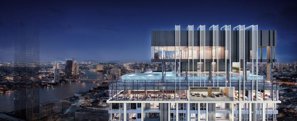 ด้านของ Infinity Edge Pool สระว่ายน้ำระบบเกลือ ที่ยาวกว่า 47 เมตร พร้อมวิวแม่น้ำเจ้าพระยาแบบ 360 องศา พร้อมอ่าง Jacuzzi ชมวิวแม่น้ำ และยังมีพื้นที่สระว่ายน้ำสำหรับเด็กในโซน Kid Pool ที่ออกแบบแยกส่วนจากโซนผู้ใหญ่เพื่อความปลอดภัย
