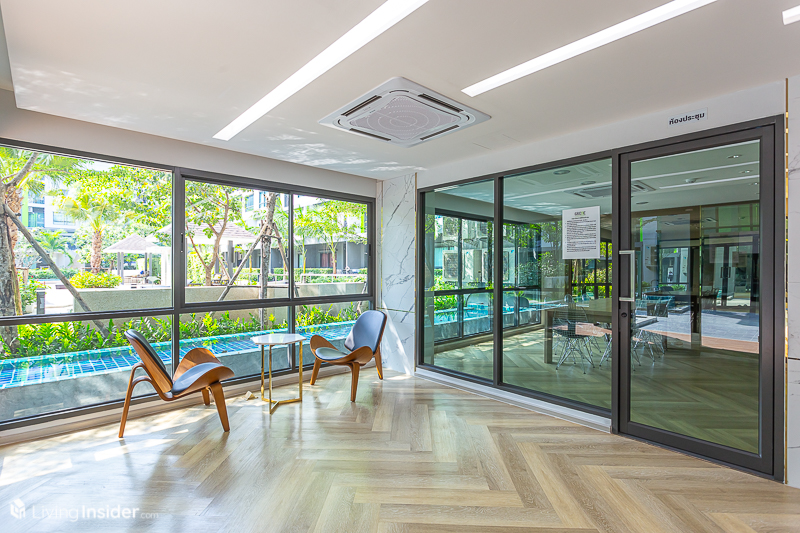 Social Lounge (Co-Working Space) เปิดรับวิวรอบด้านเห็นพื้นที่สวนด้านใน จัดมุมทำงาน นั่งพักผ่อน และ Meeting Room เป็นส่วนตัว เทควิวสระด้านนอกสวยงาม
