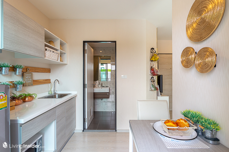ต่อด้วย ห้องครัว เป็นแบบครัวเปิดซึ่งบิวท์อิน Pantry ขนาดพอเหมาะมาให้เรียบร้อย มีพื้นที่เตรียมอาหาร ให้ตู้เก็บของด้านบนมาด้วย พร้อมกับโต๊ะทานอาหาร 2 ที่นั่ง มาครบเซ็ต