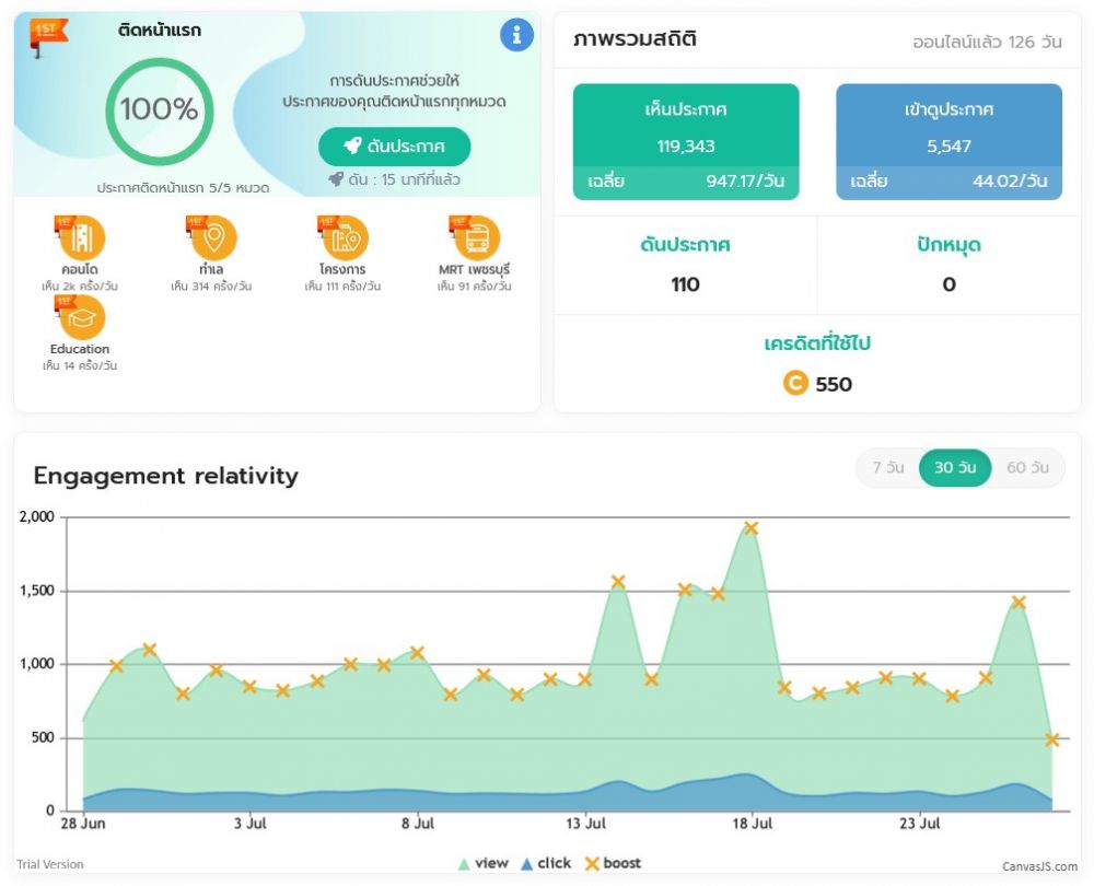 โดยในแต่ละประกาศของคุณจะมีสถิติให้ดูว่า มีคนเข้าชมประกาศของท่านมากน้อยแค่ไหนในแต่ละวันครับ และท่านยังสามารถทำการโฆษณาประกาศของท่านให้มีคนเห็นมากขึ้นได้อีกด้วย