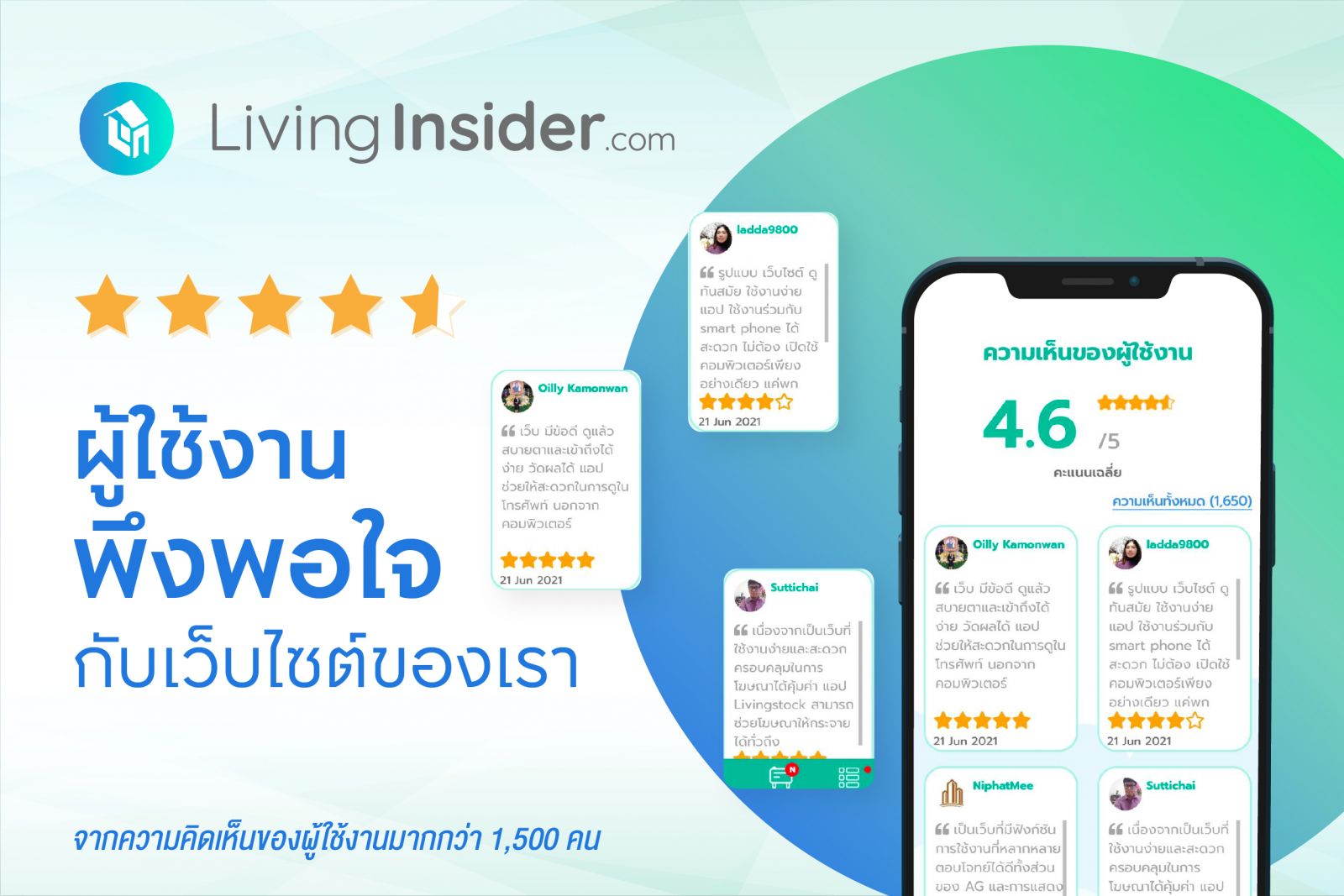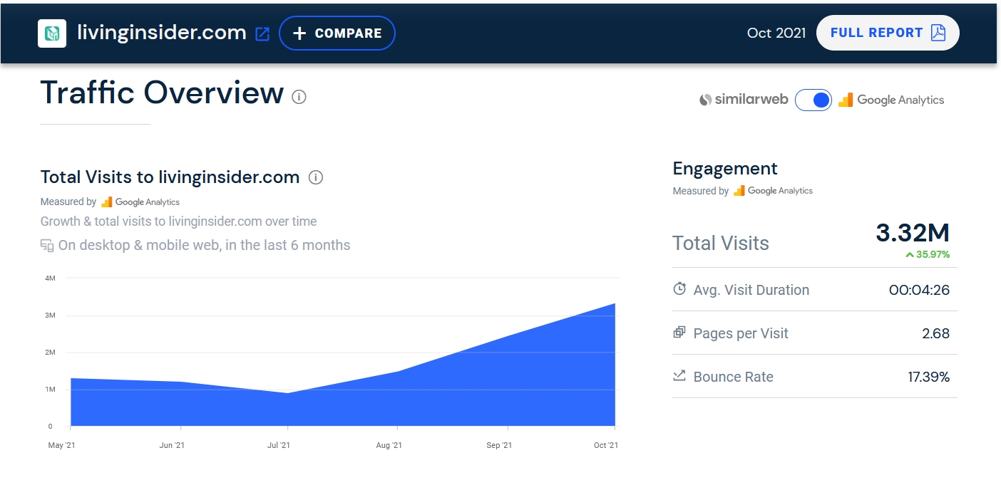 ปัจจุบัน Livinginsider.com เป็นเว็บอสังหาฯของคนไทยที่มียอดผู้ใช้งาน อันดับ 1 ของประเทศครับ ยอดผู้ใช้งานต่อเดือนกว่า 3,30,000 คน โดยมีการคลิกดูประกาศต่างๆรวมกันมากกว่า 9,500,000 ครั้งต่อเดือน