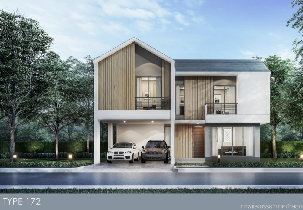 1. แบบ “GABLE172” ขนาดเริ่มต้น 50 ตารางวา พื้นที่ใช้สอย 172 ตารางเมตร 3 ห้องนอน 2 ห้องน้ำ 1 ห้องน้ำแขก 2 ที่จอดรถ มี 73 ยูนิต