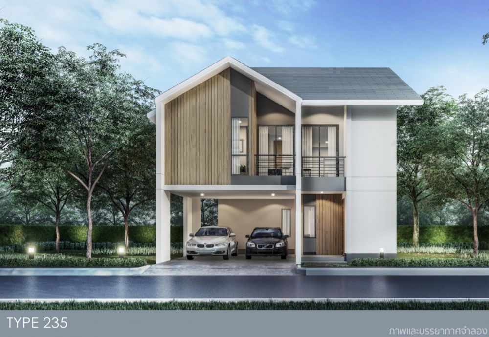 2. แบบ “GABLE235” ขนาดเริ่มต้น 54.2 ตารางวา พื้นที่ใช้สอย 235 ตารางเมตร 4 ห้องนอน 4 ห้องน้ำ 2 ที่จอดรถ มี 54 ยูนิต