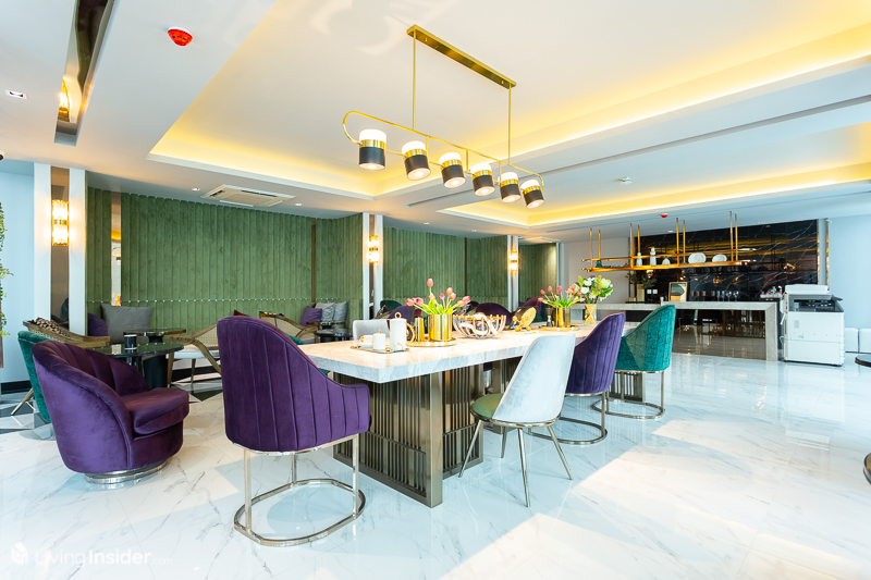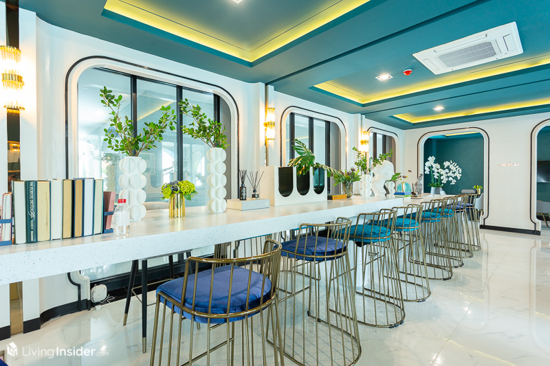 Luxe Co-Creation Space อยู่ในคลับเฮ้าส์มองเห็นทั้งวิวสระว่ายน้ำและวิวสวน ตกแต่งด้วยโทนสีฟ้าเหมาะแก่การนั่งทำงาน อยากนั่งคนเดียวหรือปรึกษาประชุมกันเป็นกลุ่ม ก็มีห้องให้เลือกสรรตามใจชอบ